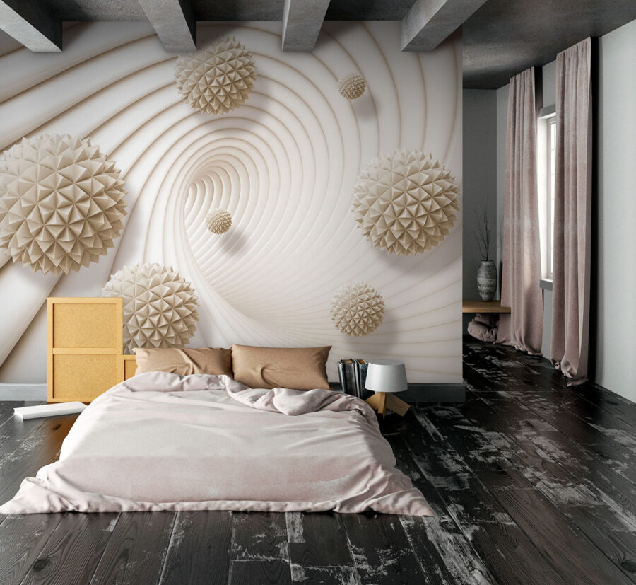 Stellen Sie sich vor, Sie betreten einen Raum und haben das Gefühl, eine schicke, moderne Kunstgalerie betreten zu haben. Dieses Wandbild mit seinen abstrakten weißen Kugeln, die mit Dreiecken bedeckt sind, verleiht Ihrem Raum sofort einen coolen 3D-Tunnel-Effekt. Es ist, als würde man in eine futuristische Dimension eintauchen – ohne den Komfort des eigenen Zuhauses zu verlassen. Die Mischung aus Geometrie und Tiefe verleiht jedem Raum einen Hauch von Faszination. Es ist die Art von Design, die zu Gesprächen anregt, egal ob Sie sich mit einem guten Buch entspannen oder ein zwangloses Beisammensein veranstalten. Ein kleines Stück Avantgarde-Stil, das den Alltag auflockert und aus langweiligen Wänden einen Punkt der Faszination macht.