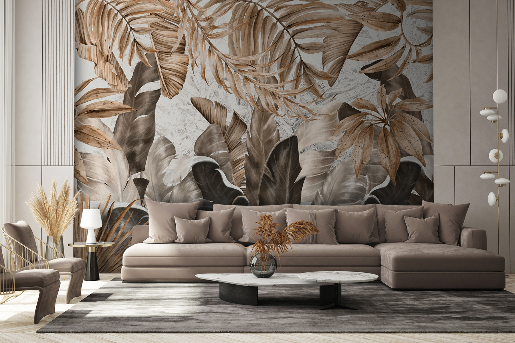Stellen Sie sich vor, Sie betreten Ihr Wohnzimmer und fühlen sich in ein heiteres tropisches Paradies versetzt. Dieses Wandbild “Tropische Blätter in erdigen Tönen” schafft genau das. Die atemberaubenden, übergroßen Blätter mit ihren satten, erdigen Farbtönen bringen einen Hauch von Natur direkt in Ihr Zuhause. Das ist nicht einfach nur eine trendige Tapete – es ist ein Statement, fast so, als hätte man ein riesiges, wunderschönes Stück moderner Kunst an der Wand hängen.