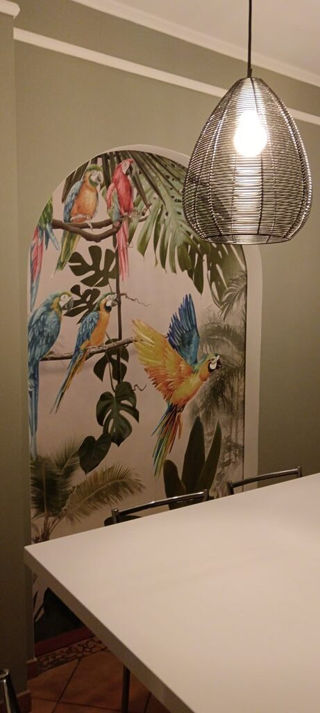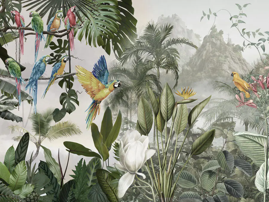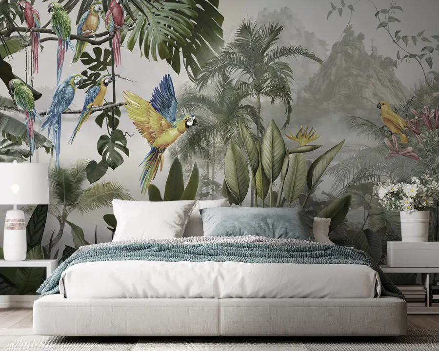 Verwandeln Sie jede Wand in einen lebendigen Zufluchtsort mit dieser atemberaubenden Fototapete mit farbenfrohen Papageien, die sich im Flug befinden. Stellen Sie sich vor, Sie betreten einen Raum, in dem diese gefiederten Freunde durch die Luft zu fliegen scheinen, wobei jedes Krächzen den Reiz eines tropischen Paradieses widerspiegelt. Es ist, als würde man sich ein Stück Natur ins Haus holen, nur ohne die Feuchtigkeit. Die üppigen Blätter und leuchtenden Blüten lassen den Raum lebendig erscheinen und schaffen eine traumhafte Kulisse, die Freude und Wärme ausstrahlt.