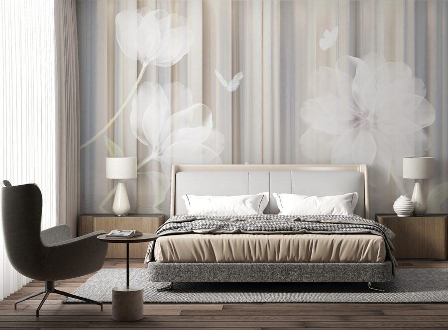 Verwandeln Sie jeden Raum in einen ruhigen Zufluchtsort mit diesem verträumten, floralen Wandbild, das zarte Blüten und anmutige Schmetterlinge zeigt. Es fühlt sich an, als würde man einen ruhigen Garten betreten, in dem jeder Blick einen Moment der Ruhe einlädt. Stellen Sie sich vor, Sie machen es sich mit einem guten Buch gemütlich und lassen sich von den sanften Farbtönen wie von einer Umarmung umhüllen. Diese Fototapete eignet sich perfekt für ein Wohnzimmer oder eine ruhige Ecke und ist nicht nur schön, sondern schafft auch eine großzügige Atmosphäre. Es ist ein reizvoller Anblick, der Besucher dazu bringt, innezuhalten, zu bewundern und vielleicht sogar ein wenig zu träumen. Wer hätte gedacht, dass Wände zu so schönen Tagträumen anregen können?