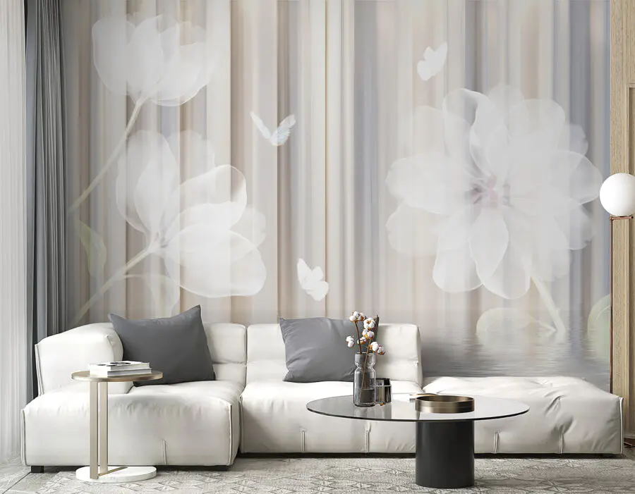 Verwandeln Sie jeden Raum in einen ruhigen Zufluchtsort mit diesem verträumten, floralen Wandbild, das zarte Blüten und anmutige Schmetterlinge zeigt. Es fühlt sich an, als würde man einen ruhigen Garten betreten, in dem jeder Blick einen Moment der Ruhe einlädt. Stellen Sie sich vor, Sie machen es sich mit einem guten Buch gemütlich und lassen sich von den sanften Farbtönen wie von einer Umarmung umhüllen. Diese Fototapete eignet sich perfekt für ein Wohnzimmer oder eine ruhige Ecke und ist nicht nur schön, sondern schafft auch eine großzügige Atmosphäre. Es ist ein reizvoller Anblick, der Besucher dazu bringt, innezuhalten, zu bewundern und vielleicht sogar ein wenig zu träumen. Wer hätte gedacht, dass Wände zu so schönen Tagträumen anregen können?