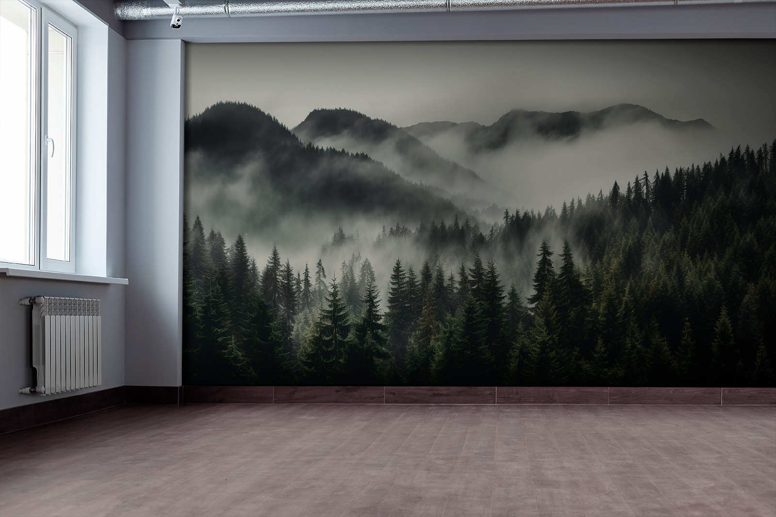 Stellen Sie sich vor, Sie verwandeln Ihren Wohnraum mit diesem atemberaubenden Wandbild mit Bäumen und nebelverhangenen Bergen in eine heitere Waldoase. Jedes Mal, wenn Sie den Raum betreten, ist es, als würden Sie in ein Märchen eintauchen. Perfekt für alle, die die freie Natur lieben – ohne sich Gedanken über Ungeziefer oder das Wetter machen zu müssen. Der dichte Wald, der in dunstige Berge übergeht, ist einfach magisch, fast so, als würden sich die Bäume gegenseitig Geheimnisse zuflüstern.