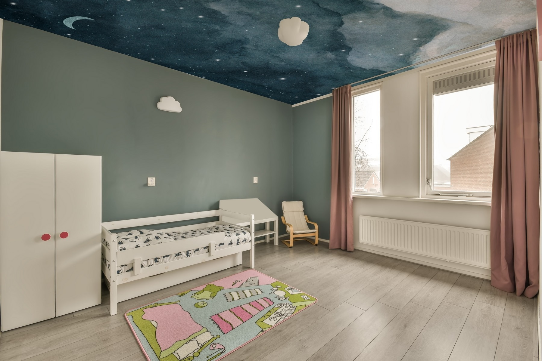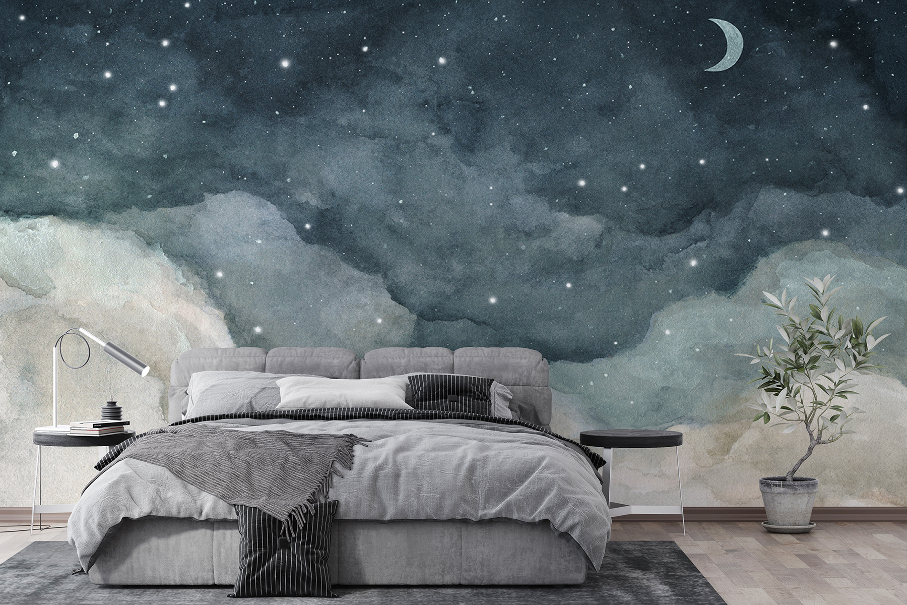 Die sanften Aquarellfarben geben dem Ganzen eine ruhige und magische Note. Diese ruhigen Wolken und verstreuten Sterne? Vollkommen beruhigend. Es ist, als hätte man sein eigenes Stück des Nachthimmels in den eigenen vier Wänden. Kinder (und, ehrlich gesagt, auch Erwachsene) werden es lieben, unter dieser himmlischen Szene einzuschlafen. Eine wunderbare Kulisse für eine Gute-Nacht-Geschichte!