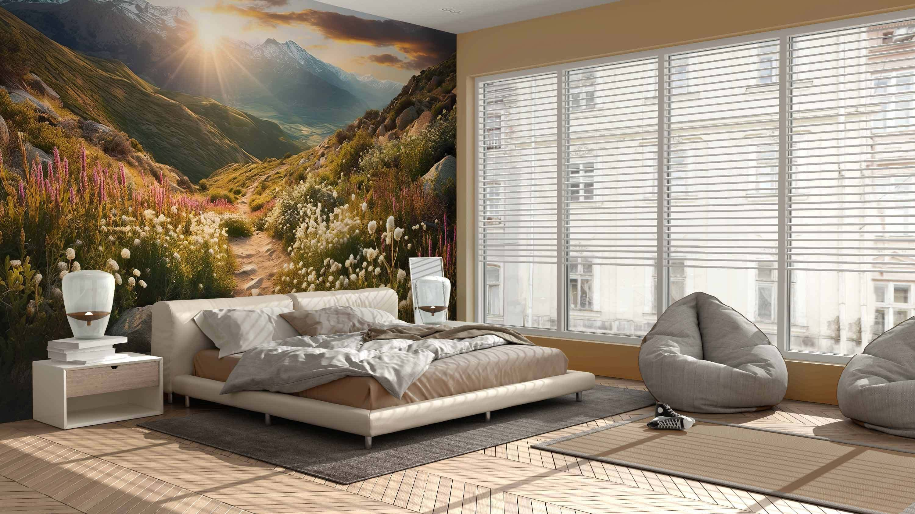 Verwandeln Sie einen tristen Raum in einen verträumten Rückzugsort mit den “Fototapeten Sunset Over Mountain Flower Trail”. Stellen Sie sich vor, Sie treten in eine heitere Welt ein, in der pulsierende Wildblumen im Wind tanzen und sich majestätische Berge ins Unendliche erstrecken. Diese Fototapete lädt Sie dazu ein, tief durchzuatmen, die Wärme eines Sonnenuntergangs zu spüren und die Ruhe der Natur in Ihrem Zuhause zu genießen.