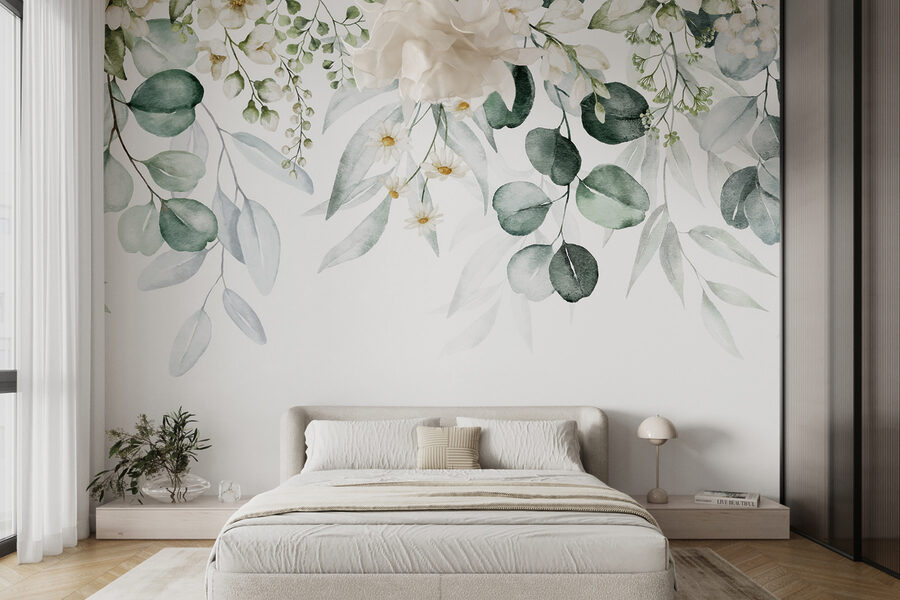 Verwandeln Sie jeden Raum in eine heitere Oase mit dieser atemberaubenden Fototapete, die elegantes Laub und reizvolle Blumenarrangements zeigt. Stellen Sie sich vor, Sie betreten einen Raum, in dem üppiges Grün und zarte Blüten Sie wie eine einladende Umarmung begrüßen. Es ist, als ob man sich die Natur ins Haus holt, nur ohne die Ungeziefer – und wer liebt das nicht? Dieses Wandbild strahlt Charme aus und eignet sich perfekt für eine gemütliche Leseecke oder ein stilvolles Wohnzimmer. Der Aquarell-Effekt sorgt für eine verträumte Atmosphäre, die es leicht macht, bei einer Tasse Tee die Zeit zu vergessen. Die Gäste werden in den Bann gezogen und nehmen sich wahrscheinlich einen Moment Zeit, um die Kunst zu genießen. Ob für ein frisches Update oder eine komplette Neugestaltung, dieses Wandbild verspricht, jeden Bereich mit Wärme und Lebendigkeit zu erfüllen. Lassen Sie sich von der Schönheit der Natur für Ihren Alltag inspirieren!