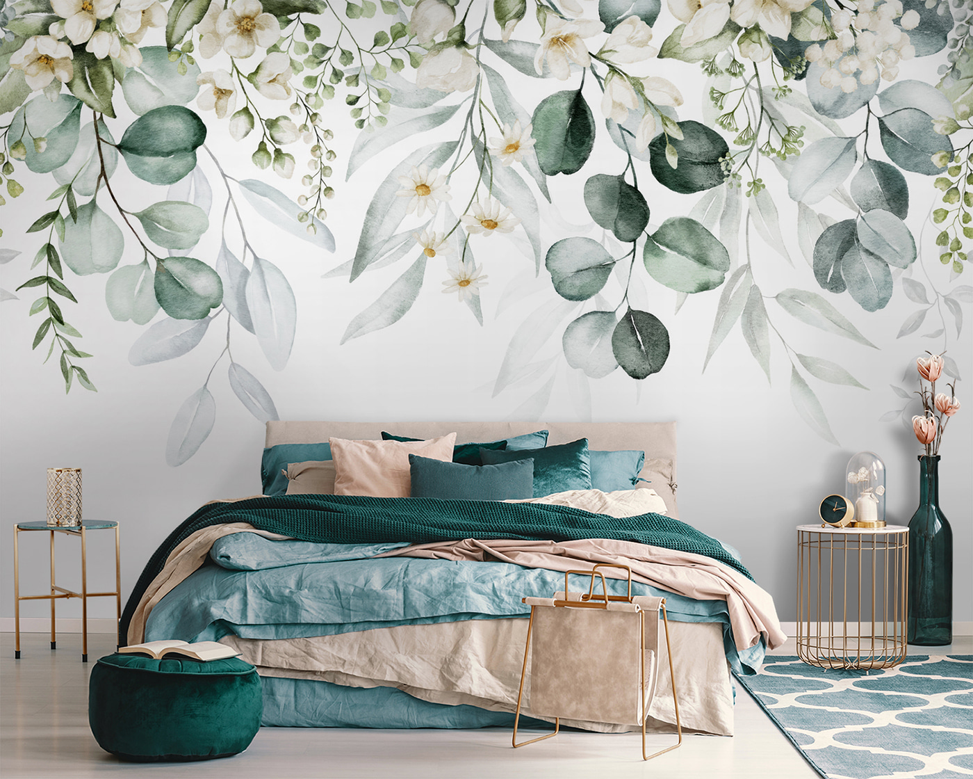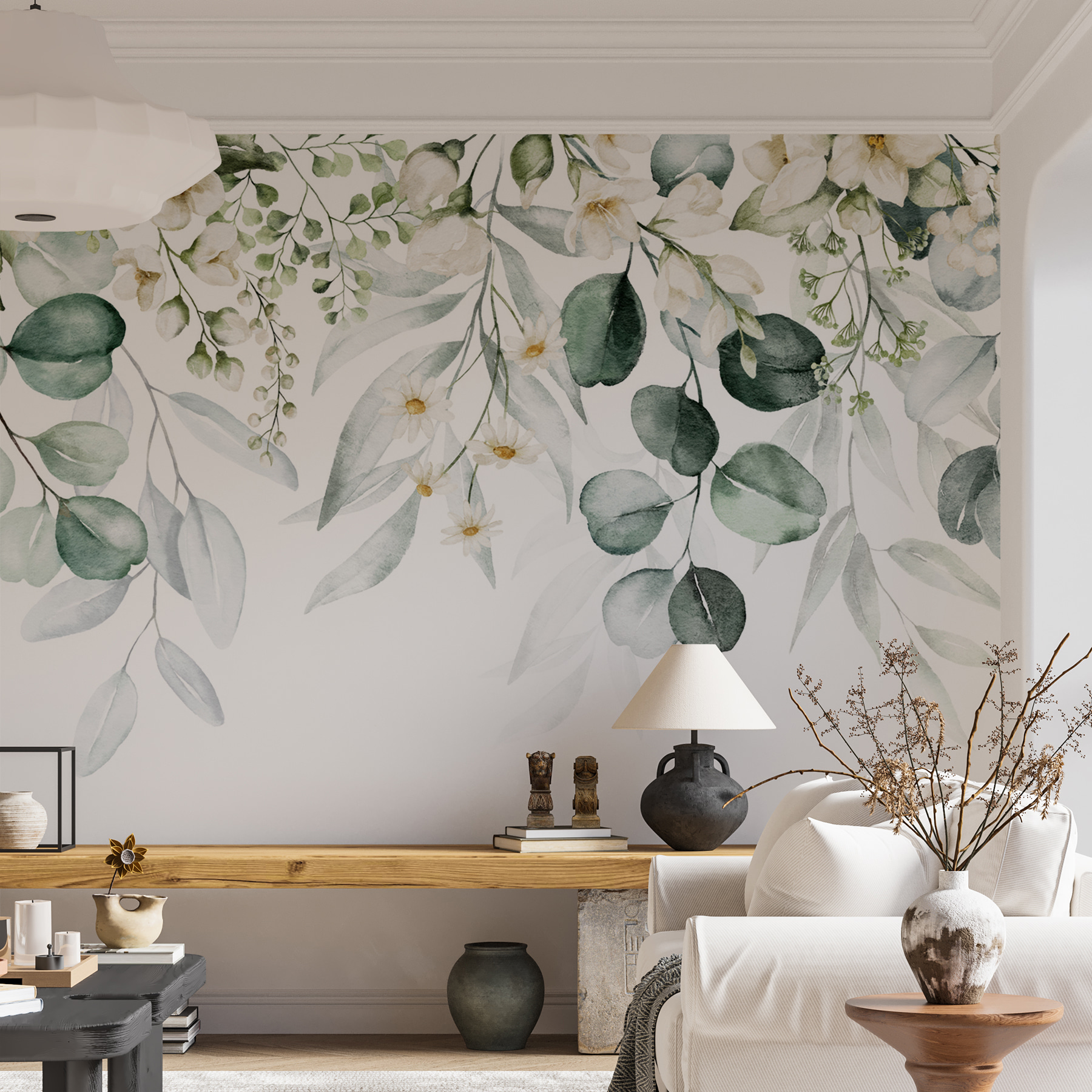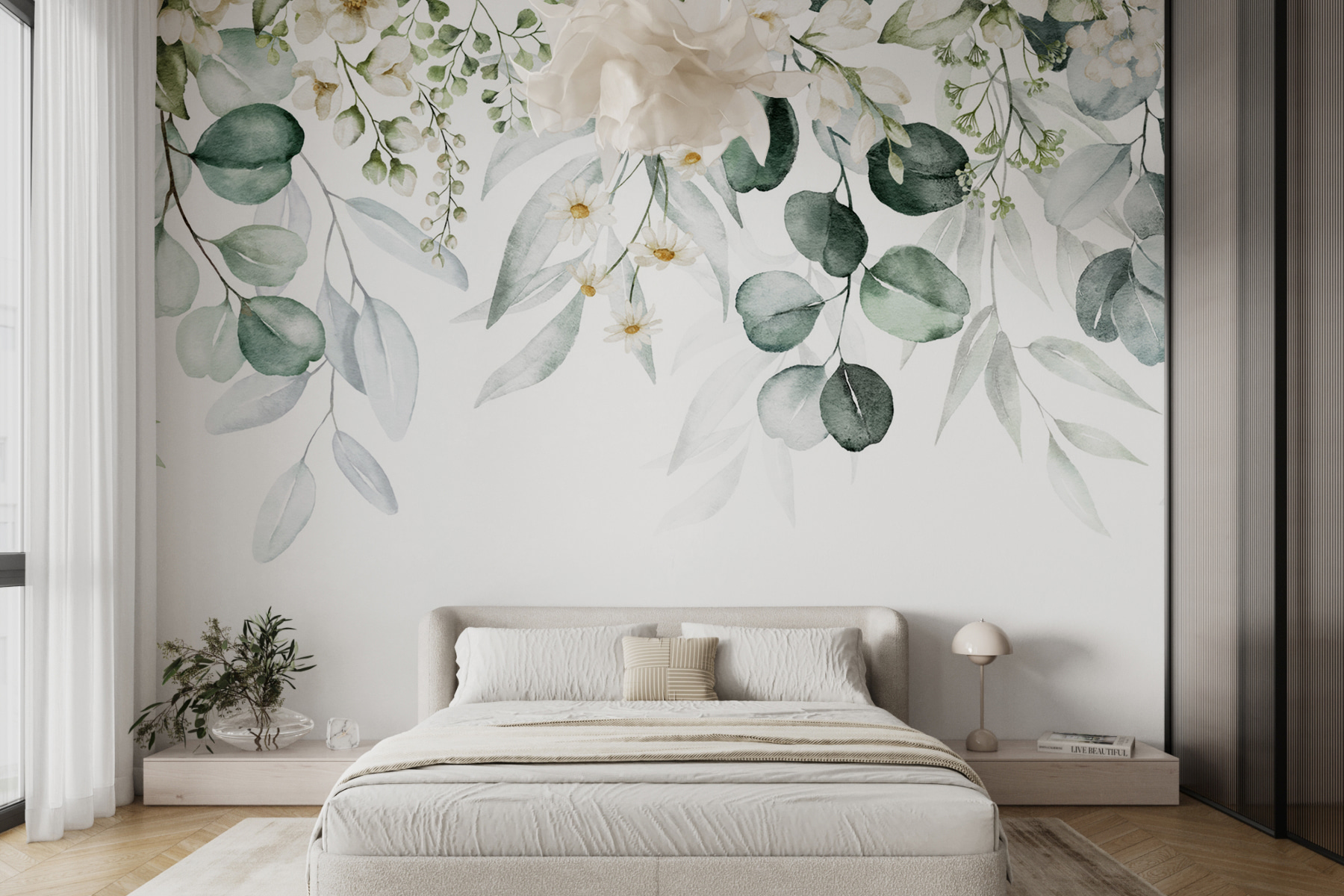 Verwandeln Sie jeden Raum in eine heitere Oase mit dieser atemberaubenden Fototapete, die elegantes Laub und reizvolle Blumenarrangements zeigt. Stellen Sie sich vor, Sie betreten einen Raum, in dem üppiges Grün und zarte Blüten Sie wie eine einladende Umarmung begrüßen. Es ist, als ob man sich die Natur ins Haus holt, nur ohne die Ungeziefer – und wer liebt das nicht? Dieses Wandbild strahlt Charme aus und eignet sich perfekt für eine gemütliche Leseecke oder ein stilvolles Wohnzimmer. Der Aquarell-Effekt sorgt für eine verträumte Atmosphäre, die es leicht macht, bei einer Tasse Tee die Zeit zu vergessen. Die Gäste werden in den Bann gezogen und nehmen sich wahrscheinlich einen Moment Zeit, um die Kunst zu genießen. Ob für ein frisches Update oder eine komplette Neugestaltung, dieses Wandbild verspricht, jeden Bereich mit Wärme und Lebendigkeit zu erfüllen. Lassen Sie sich von der Schönheit der Natur für Ihren Alltag inspirieren!