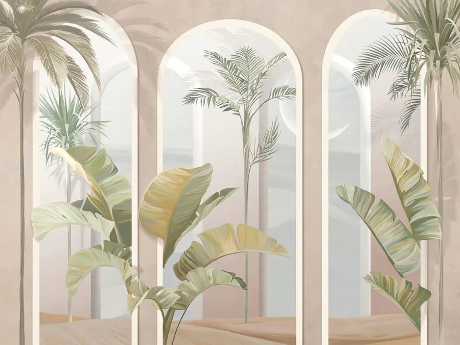 1 Rezension für Fototapeten Rundbogenfenster mit tropischen Pflanzen