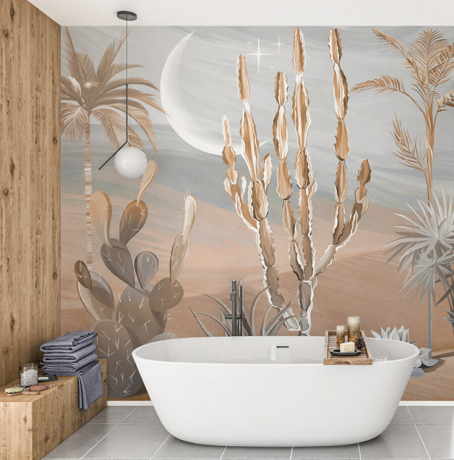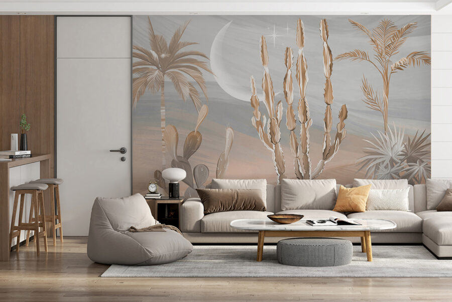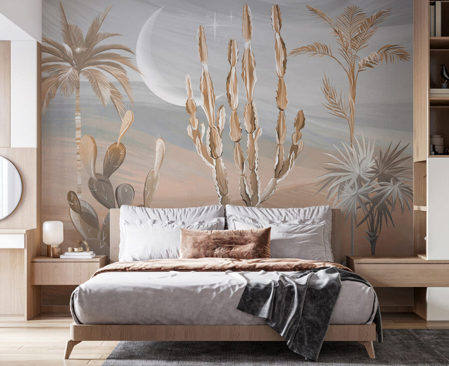 Sehen Sie sich dieses tolle Wandbild an! Stellen Sie sich vor, Sie holen sich ein Stück Wüste in Ihr Wohnzimmer – Kakteen, Palmen und diese verträumte Landschaft. Es ist, als würde man eine heitere Oase betreten, ohne die sengende Hitze und die stacheligen Pflanzen. Perfekt, um einen Hauch von Fernweh in jeden Raum zu bringen.