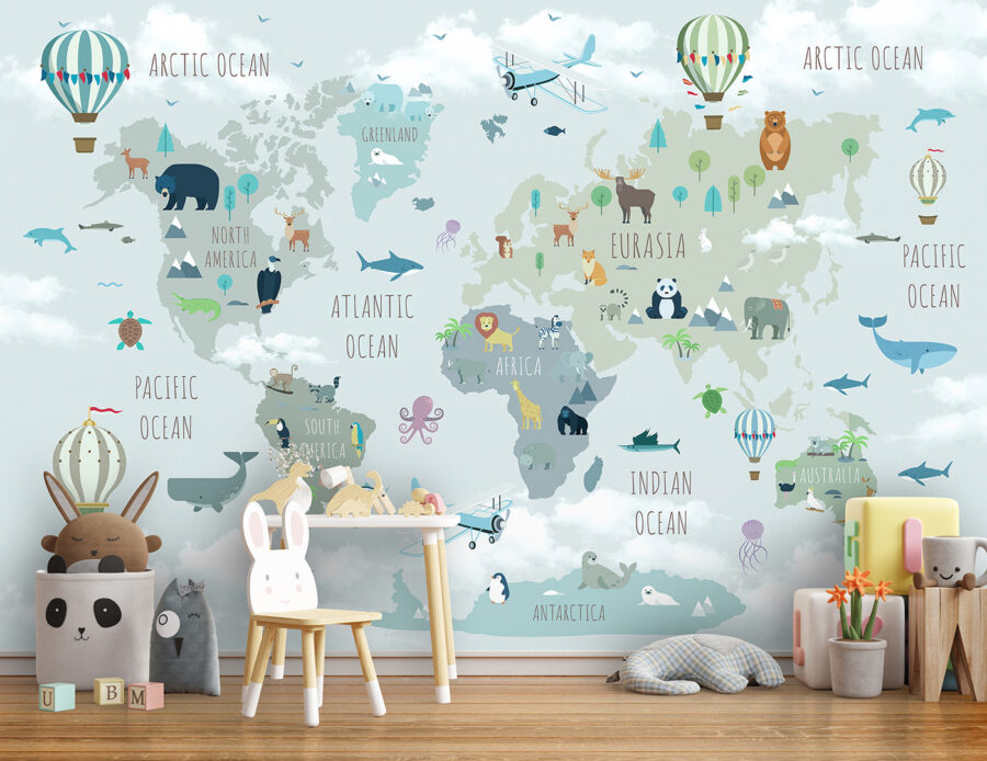 Haben Sie schon einmal daran gedacht, Ihr Kind auf eine Reise um die Welt mitzunehmen, ohne sein Zimmer zu verlassen? Diese Fototapete “Heißluftballon mit Flaggen” macht es möglich – und macht auch noch Spaß! Es ist nicht nur eine Karte, es ist ein Abenteuer. Stell dir vor, du schwebst in einem bunten Heißluftballon durch die Wolken, entdeckst niedliche Tiere und erkundest Kontinente. Sie ist perfekt für Neugierige und Tagträumer.