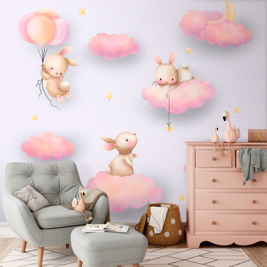 Stellen Sie sich vor, das Zimmer Ihres Kindes verwandelt sich in eine skurrile Traumlandschaft mit dieser bezaubernden Cartoon-Hasen-Wandmalerei! Die süßen Häschen schweben auf Wolken, halten Fäden in der Hand und greifen nach den Sternen – es ist wie eine Szene aus einer Gutenachtgeschichte! Perfekt für Kinderzimmer – ob für Ihren Sohn, Ihre Tochter oder einfach nur, um einen Hauch von Magie in jedes Kinderzimmer zu bringen.