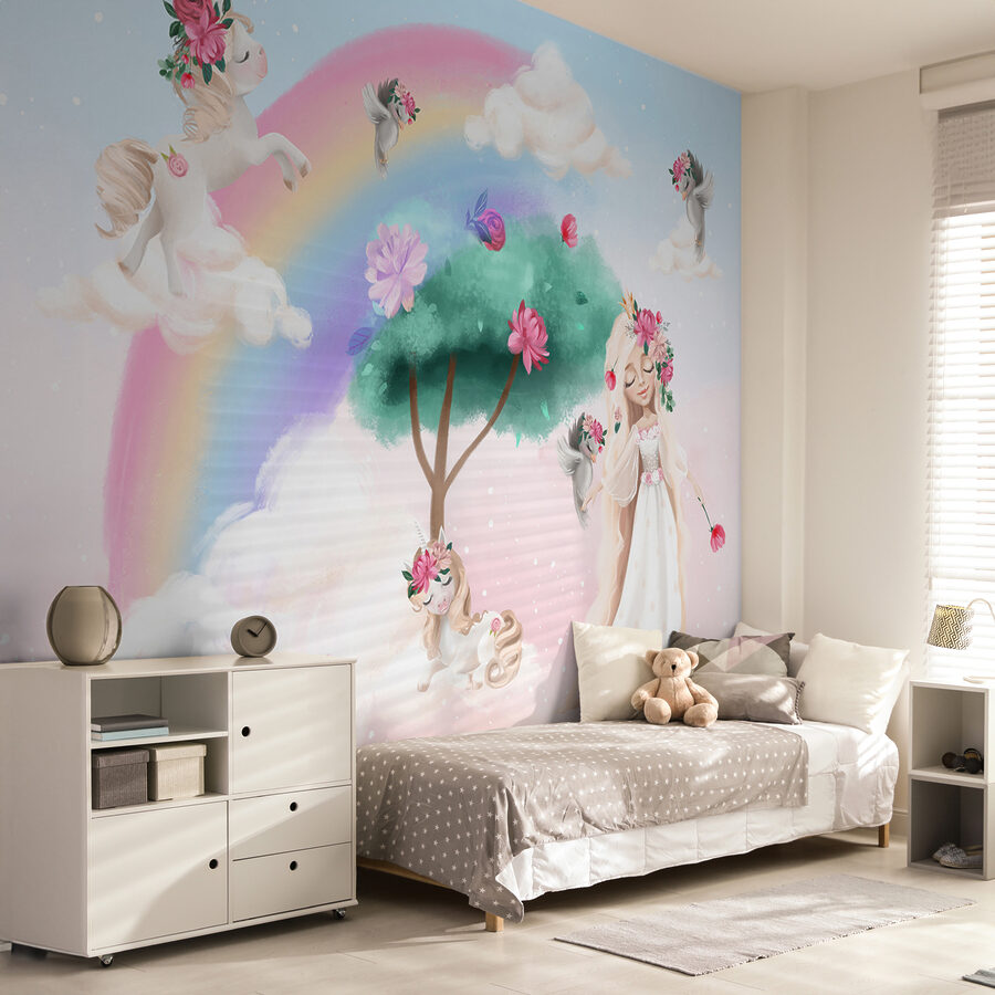 Stellen Sie sich vor, Sie betreten ein Zimmer, in dem Einhörner auf flauschigen Wolken tänzeln und Regenbögen sich anmutig über eine skurrile Szene wölben. Diese Fototapete “Einhörner und Regenbögen in magischer Szene” verwandelt jedes Kinderzimmer in ein traumhaftes Paradies. Es eignet sich perfekt für Kinderzimmer, Spielzimmer und alle Räume von Einhorn-Liebhabern, da es leuchtende Farben und Fantasie-Elemente kombiniert, die die Fantasie anregen. Stellen Sie sich vor, wie Ihr Kind die bezaubernden Einhörner bestaunt und vielleicht sogar von eigenen Abenteuern träumt. Es ist nicht nur ein Wandbild – es ist jeden Tag ein magisches Erlebnis! Außerdem ist es eine lustige Art und Weise, Geschichten zu erzählen oder die Schlafenszeit noch ein bisschen verzauberter zu gestalten.