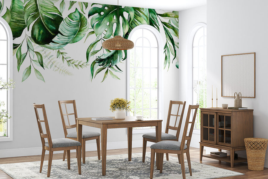 Verwandeln Sie eine triste Wand in ein Dschungelrefugium mit diesem üppigen grünen Blätterwandbild. Es ist nicht nur eine Tapete, sondern bringt eine frische Brise ins Haus. Stellen Sie sich vor, Sie schlürfen Ihren Morgenkaffee, während Sie von der schönsten Natur umgeben sind – natürlich ohne die Käfer. Die verschiedenen Farbtöne des Laubes tanzen miteinander und schaffen eine ruhige Atmosphäre, die fast an einen friedlichen Waldspaziergang erinnert. Perfekt für gemütliche Ecken oder als Blickfang in einem Wohnzimmer. Es lädt dazu ein, von tropischen Reisen zu träumen, und das ganz bequem von zu Hause aus. Stellen Sie sich nur die Komplimente vor!