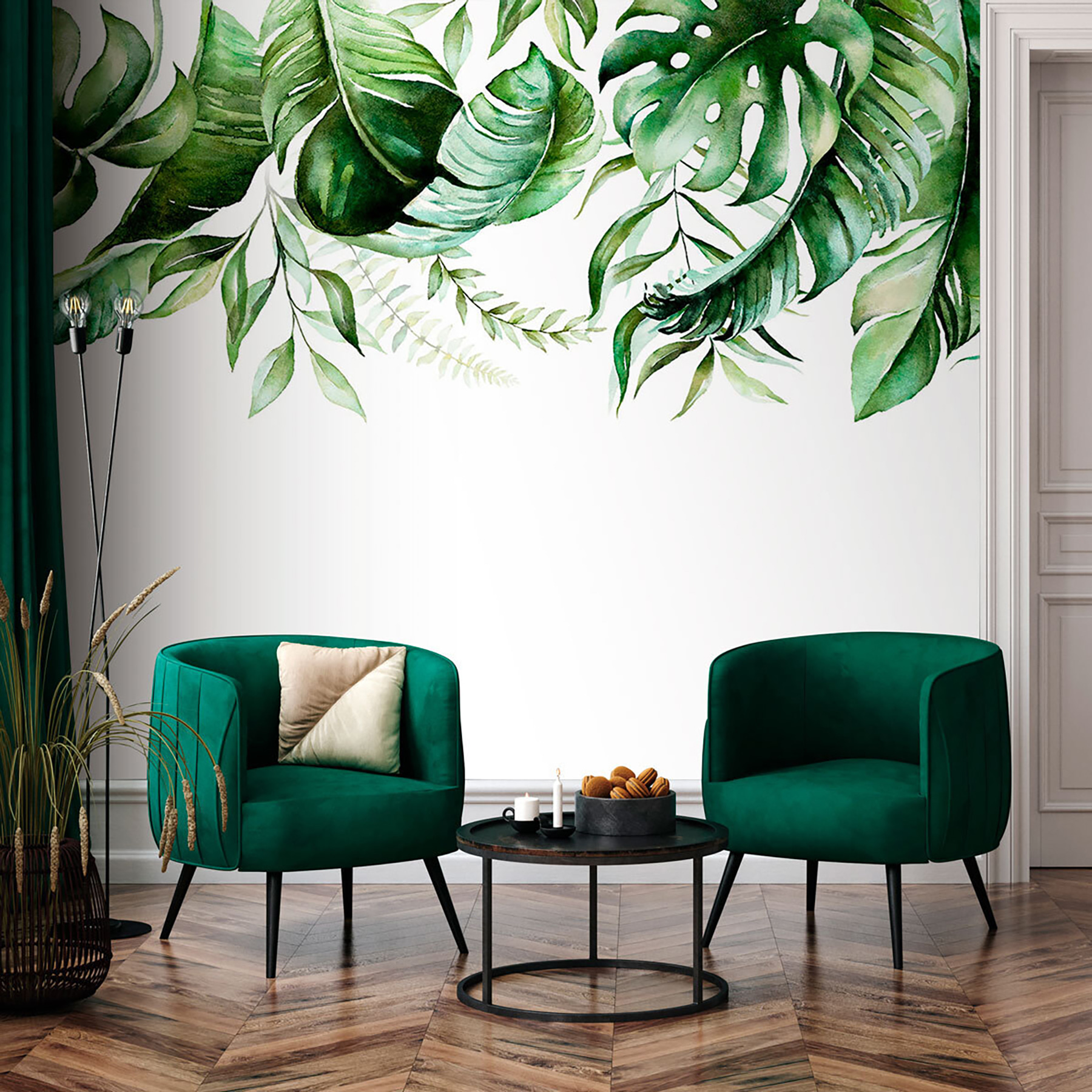 Verwandeln Sie eine triste Wand in ein Dschungelrefugium mit diesem üppigen grünen Blätterwandbild. Es ist nicht nur eine Tapete, sondern bringt eine frische Brise ins Haus. Stellen Sie sich vor, Sie schlürfen Ihren Morgenkaffee, während Sie von der schönsten Natur umgeben sind – natürlich ohne die Käfer. Die verschiedenen Farbtöne des Laubes tanzen miteinander und schaffen eine ruhige Atmosphäre, die fast an einen friedlichen Waldspaziergang erinnert. Perfekt für gemütliche Ecken oder als Blickfang in einem Wohnzimmer. Es lädt dazu ein, von tropischen Reisen zu träumen, und das ganz bequem von zu Hause aus. Stellen Sie sich nur die Komplimente vor!