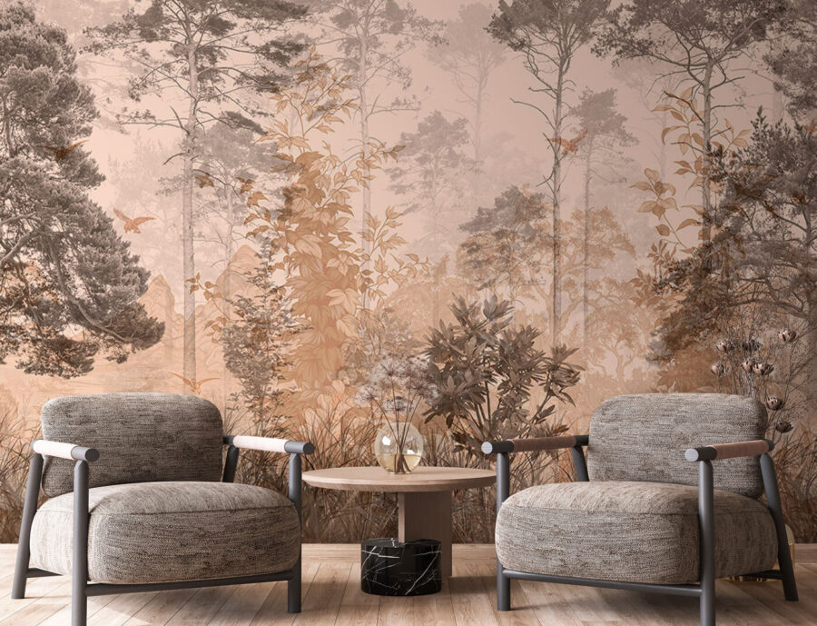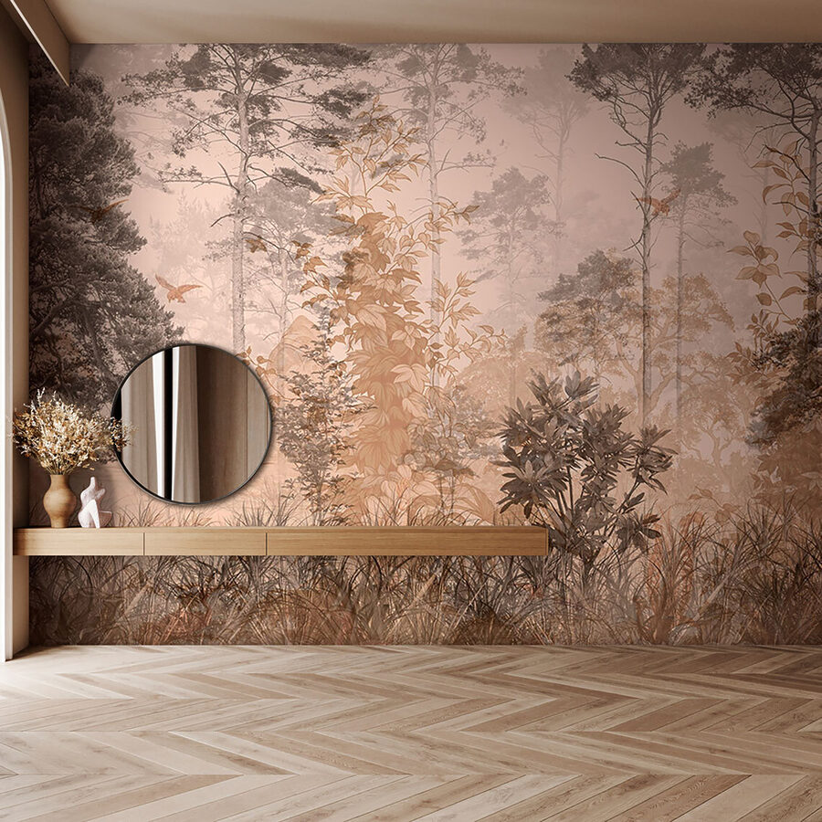 Die gedämpften Töne verbreiten eine beruhigende Stimmung, perfekt, um sich nach einem langen Tag zu entspannen. Stellen Sie sich vor, Sie schlürfen einen Tee und verlieren sich in den feinen Details der Bäume und Blätter. Es ist, als würde der Wald an Ihrer Wand lebendig werden – natürlich ohne die Käfer! Ideal für alle, die eine kleine Flucht brauchen, ohne das Haus zu verlassen. Diese Fototapete dekoriert nicht nur, sie verwandelt, indem sie eine gemütliche Oase schafft, in der man sich einfach wohl fühlt.
