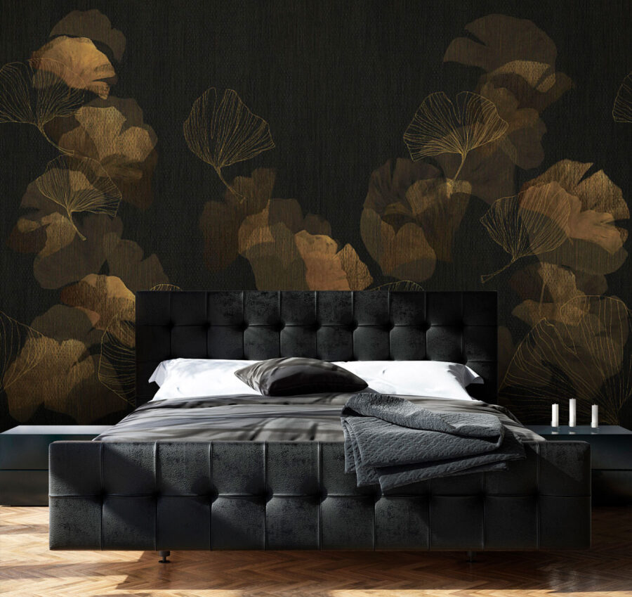 Verwandeln Sie Ihren Raum mit dieser atemberaubenden Fototapete, die zarte Blätter auf einem dunklen Hintergrund zeigt. Stellen Sie sich vor, Sie betreten einen Raum, in dem die Natur auf Eleganz trifft und Sie in eine gemütliche Umarmung einhüllt. Es verleiht den Wänden einen mühelos schicken Touch, ohne die Sinne zu überwältigen.