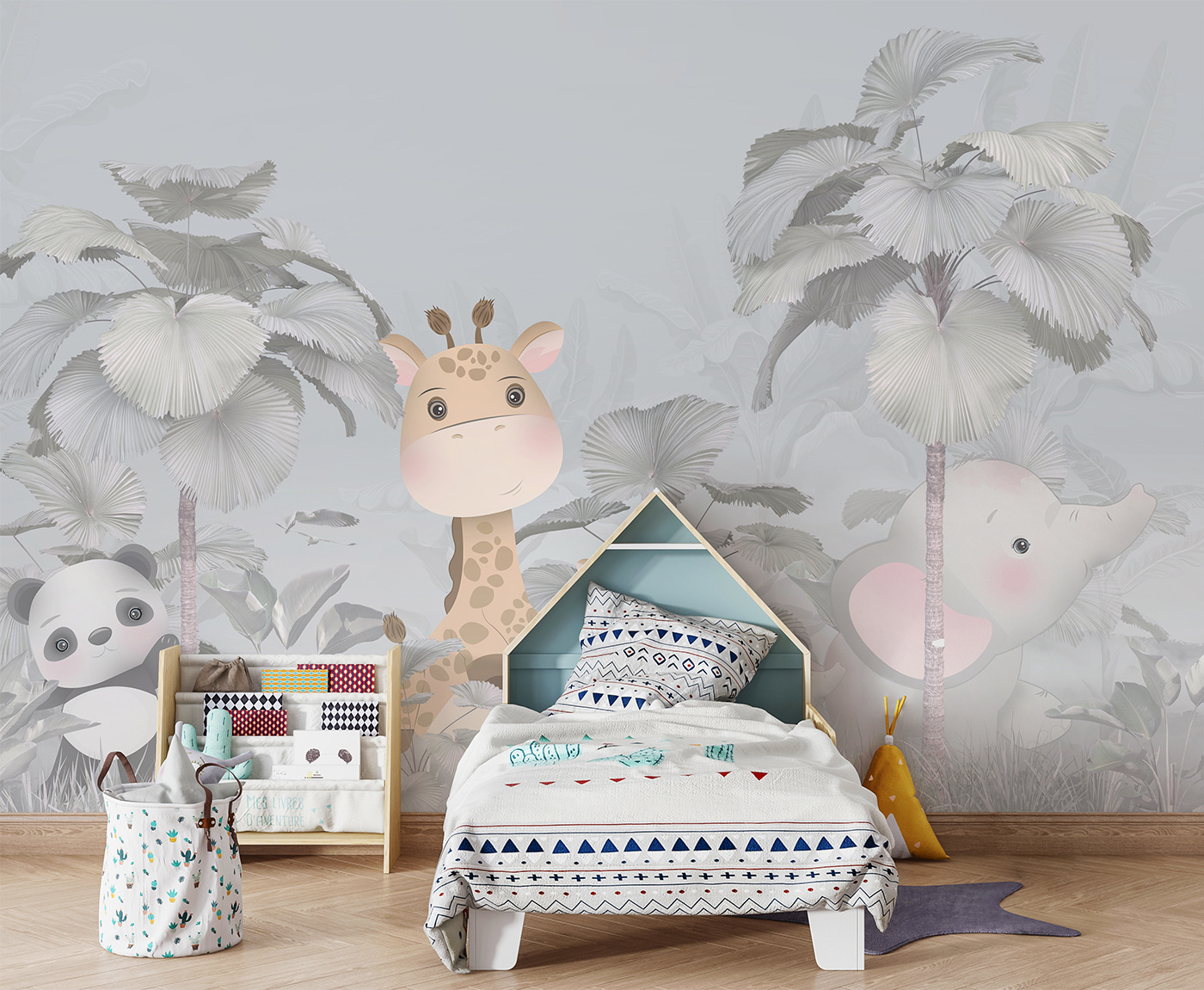 Stellen Sie sich vor, Sie betreten das Zimmer Ihres Kindes und werden von einer bezaubernden Giraffe und einem liebenswerten Elefanten begrüßt, die in einem nebligen Wald herumhängen. Die Fototapete “Giraffe und Elefant im Wald” ist wie ein lebendig gewordenes Märchenbuch. Es ist nicht nur ein hübsches Bild – es verwandelt den ganzen Raum in einen verträumten, magischen Ort. Mit seinen sanften Pastellfarben und den süßen Tieren, die mit großen Augen hinter den riesigen Blättern hervorlugen, hat es fast etwas Märchenhaftes. Es ist perfekt, um die Fantasie Ihres Kindes anzuregen und ihm einen Hauch von Naturwunder zu verleihen. Egal, ob es für einen Sohn oder eine Tochter ist, jedes Kind wird sich beim Betreten wie in einem gemütlichen, zauberhaften Dschungel fühlen. Stellen Sie sich vor, wie Sie sie abends zudecken, während diese freundlichen Gesichter über sie wachen. Außerdem ist es ein toller Gesprächsanlass – vielleicht denken Sie sich sogar Gute-Nacht-Geschichten über diese Waldfreunde aus.