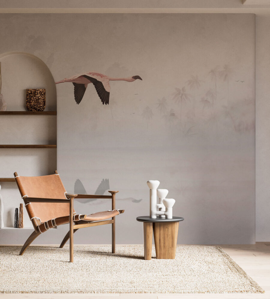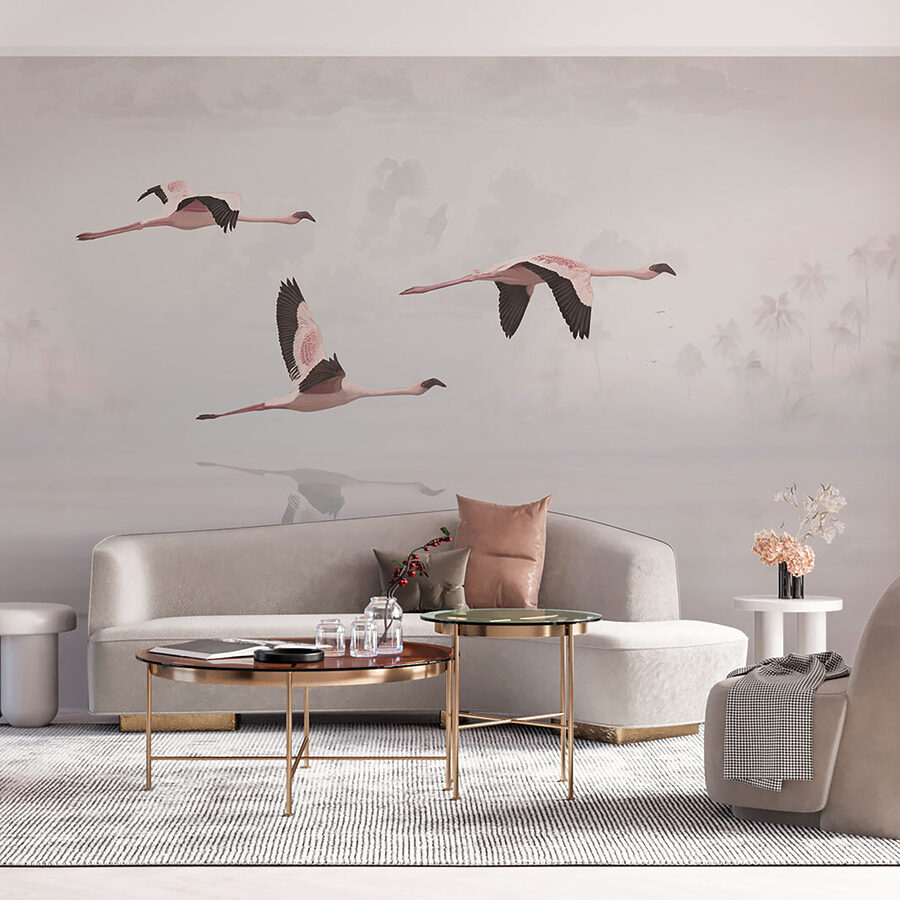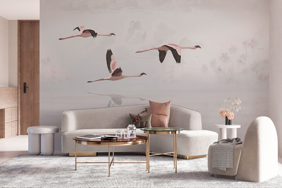 Ob im Wohnzimmer, im Schlafzimmer oder in einem kreativen Arbeitsbereich – diese Fototapete verleiht einen unerwarteten Hauch von Eleganz und Ruhe. Und wenn Sie Kinder haben, können Sie sich vorstellen, wie sehr sie sich über einen Schwarm Flamingos an der Wand freuen – das regt die Fantasie an!