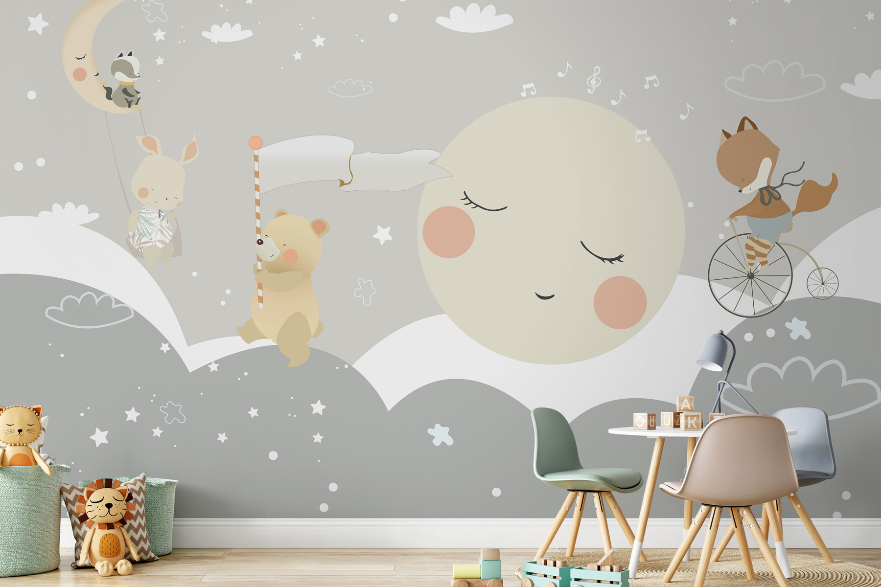 Sehen Sie sich diese bezaubernde Fototapete “Weißer Stern auf grauem Hintergrund” an. Es ist, als würde man in eine verträumte Gutenachtgeschichte eintauchen, die perfekt für ein Kinderzimmer oder ein Spielzimmer ist. Diese Fototapete zeigt einen beruhigenden grauen Hintergrund mit glitzernden Sternen, einem schläfrigen Mond und niedlichen Tierfreunden. Stellen Sie sich einen schläfrigen Bären und einen Fuchs vor, der auf einem Hochrad reitet – ein wahres Vergnügen für kleine Entdecker!