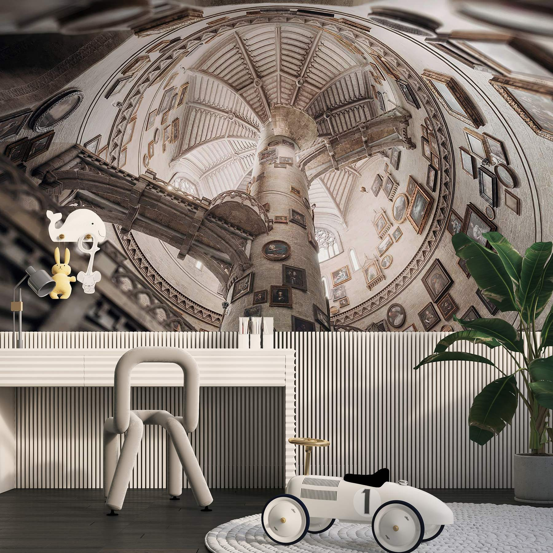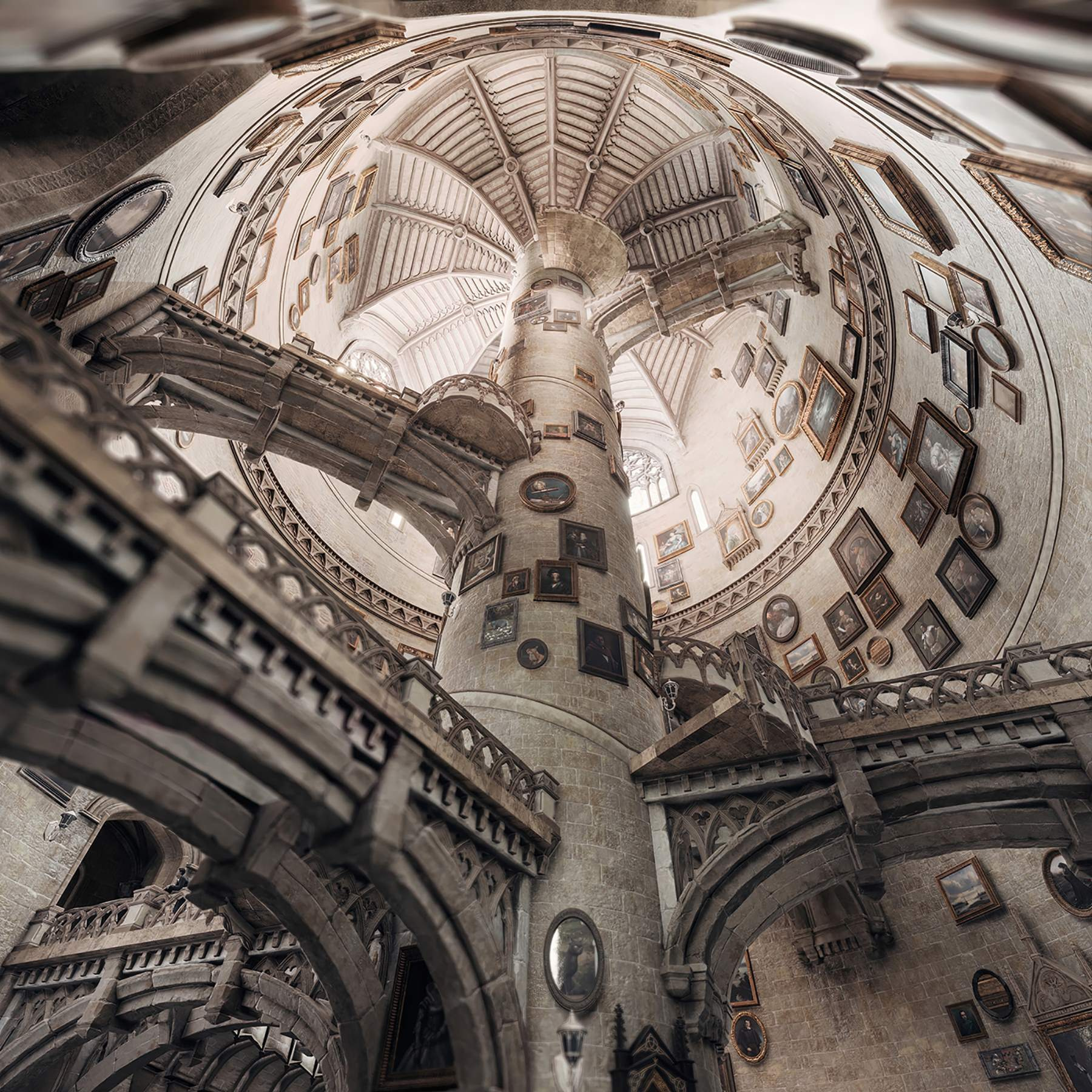 Treten Sie mit dem Wandbild “Rundes Gebäude mit mehreren Treppen” in eine skurrile Welt ein. Stellen Sie sich vor, Sie blicken nach oben und verlieren sich in der bezaubernden Spirale, in der jede Treppe zu neuen Entdeckungen führt. Der Charme der alten Porträts an den Wänden verleiht dem Ganzen einen Hauch von Skurrilität, so dass Sie sich wie auf einer Zeitreise fühlen. Stellen Sie sich vor, wie Sie mit Freunden Tee trinken, während Sie von dieser atemberaubenden Kulisse umgeben sind – und die Gespräche schweifen von der Kunst bis zu dem seltsamen Katzenvideo von letzter Woche! Dieses Wandbild ist nicht nur Dekoration, sondern auch eine Einladung, der Fantasie freien Lauf zu lassen und eigene Geschichten zu erfinden. Es eignet sich perfekt, um jedem Raum einen Hauch von Charakter zu verleihen und macht Ihre Wände definitiv zum Star der Show!