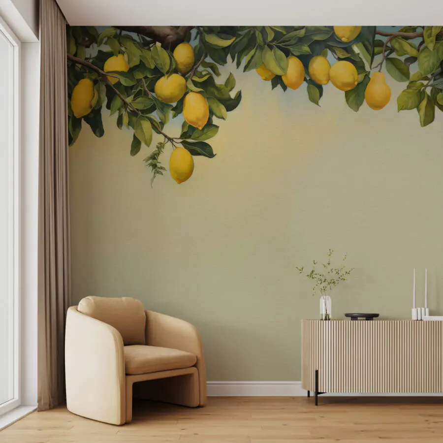 Verändern Sie jeden Raum mit dieser entzückenden Fototapete mit leuchtenden Zitronen, die von belaubten Ästen hängen. Stellen Sie sich vor, Sie betreten einen sonnenbeschienenen Hain, in dem Lebensfreude und Frische in der Luft liegen. Dieses Design bringt einen verspielten Hauch von Natur ins Haus, perfekt für Küchen oder Essbereiche, wo das Herz des Hauses schlägt. Ihre Freunde werden denken, dass Sie Ihre Wände in einen geheimen Garten verwandelt haben. Stellen Sie es sich einfach vor – hell, fröhlich und eine Erinnerung an sonnige Tage. Es ist, als würde man ein bisschen mehr Freude in die Einrichtung bringen, und jeder Blick fühlt sich an wie ein Hauch von Sommer. Eine einfache Veränderung, aber welch einen Unterschied macht sie!