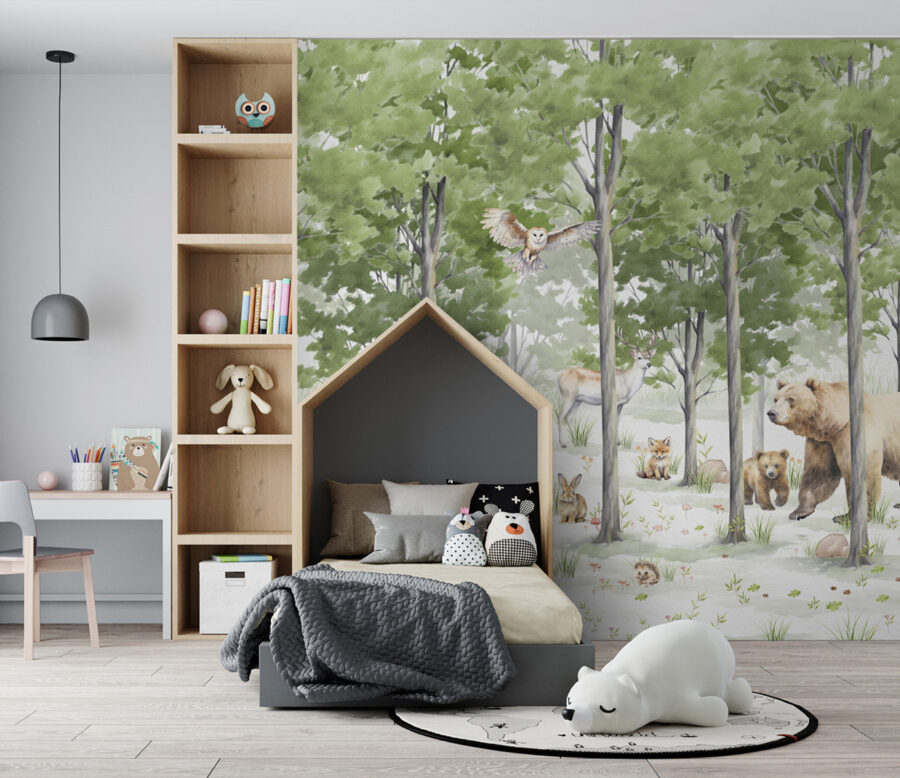 Stellen Sie sich vor, Sie betreten jeden Tag Ihren eigenen verwunschenen Wald – das ist es, was dieses Wandbild “Gruppe von Tieren im Wald” bietet. Es ist, als würden Ihre Wände von freundlichen Tieren bevölkert, von neugierigen Füchsen über majestätische Rehe bis hin zu einem verspielten Bärenbaby. Dies ist nicht nur eine Fototapete, sondern ein Fenster in eine andere Welt, in der die Luft frischer ist und der Stress einfach wegschmilzt.