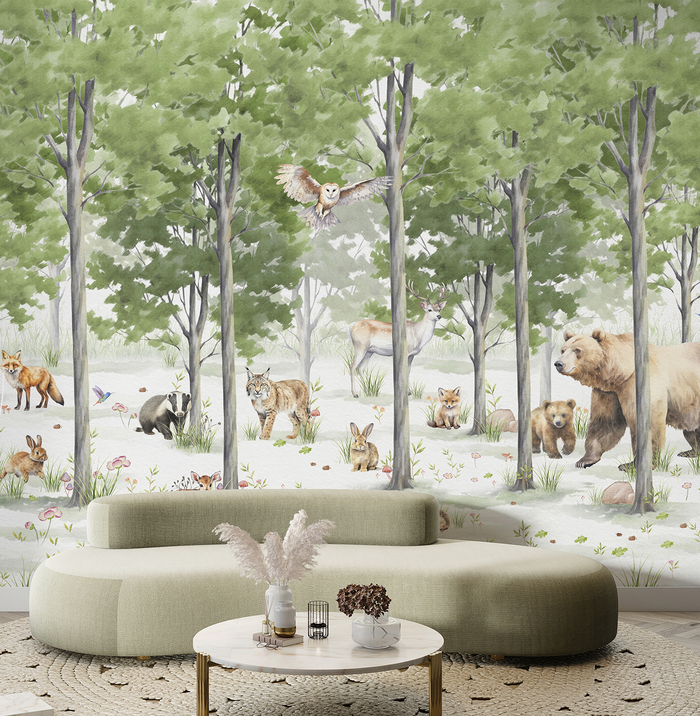 Und hey, die sanften Grüntöne und Details sind einfach beruhigend. Ob es nun das sanfte Rascheln der Blätter ist, das Sie sich vorstellen, oder die subtilen Bewegungen der Tiere, es wird jedem Raum ein bisschen mehr Magie verleihen. Perfekt für alle, die von der Natur träumen, ohne die lästigen Mücken. Nur zu, lassen Sie Ihre Wände eine Geschichte erzählen.
