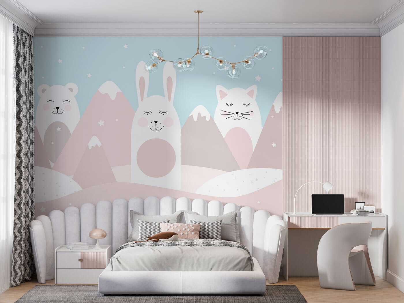 Stellen Sie sich vor, Sie betreten das Zimmer Ihres Kindes und werden von einem niedlichen Trio von Tieren in den schönsten Pastellfarben begrüßt. Dieses skurrile Wandbild zeigt eine weiße Katze mit rosafarbenen Wangen, eingebettet zwischen einem freundlichen Hasen und einem Bären, die sich in einer verträumten Landschaft mit sanften Bergen und funkelnden Sternen aufhalten. Es ist wie eine lebendig gewordene Gute-Nacht-Geschichte! Dieses Wandbild ist perfekt für alle kleinen Entdecker und Tierliebhaber und bringt einen Hauch von Magie und Freude in ihre Räume. Die sanften Farben und die liebenswerten Charaktere werden sicher zu süßen Träumen und großen Abenteuern inspirieren. Eltern lieben es, weil es wie eine friedliche, phantasievolle Umarmung für das Zimmer ist – wer würde das nicht wollen?