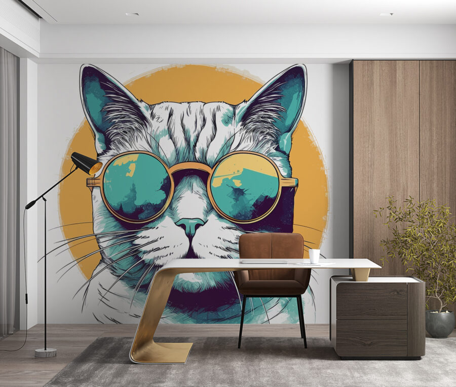 Mach dich bereit, die coolste Katze der Stadt zu treffen! Diese Fototapete zeigt eine stilvolle Katze mit einer leicht übergroßen Sonnenbrille, die jedem Raum einen Hauch von Laune und Persönlichkeit verleiht. Stellen Sie sich vor, Sie betreten Ihren Raum und werden von dieser charmanten Katze begrüßt – es ist, als hätten Sie einen kleinen Kumpel, der Sie daran erinnert, das Leben ein bisschen weniger ernst zu nehmen. Dieses Wandbild ist ideal für Kinderzimmer oder einfach für alle, die einzigartige Dekorationen lieben, und bringt einen Hauch von Spaß und Farbe ins Zimmer. Es ist die Art von Wandbild, die Gespräche anregt und ein Lächeln hervorruft – wer würde sich diese Art von Atmosphäre nicht wünschen? Es eignet sich perfekt als verspielter Akzent in einem Wohnzimmer oder als fröhliche Ergänzung eines Spielzimmers und könnte zu wahrhaft albernen Geschichten und Lachen inspirieren.