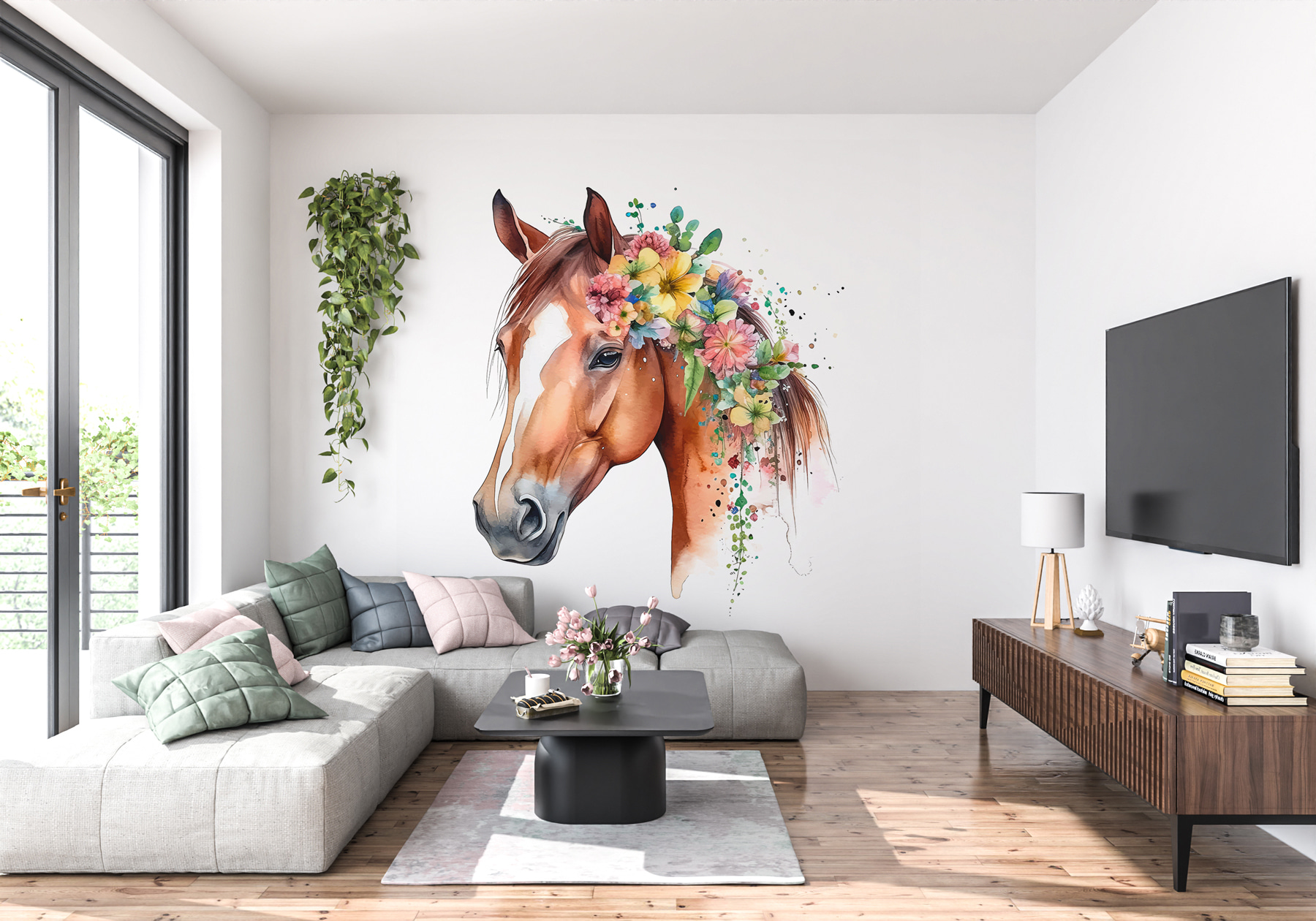 Stellen Sie sich vor, Sie betreten einen Raum und werden von einem majestätischen, mit leuchtenden Blumen geschmückten Pferd begrüßt. Genau das macht dieses Wandbild – es verwandelt eine schlichte Wand in eine entzückende Überraschung! Es ist perfekt für Tierliebhaber, Kinder oder jeden, der seinem Raum einen Hauch von Laune verleihen möchte. Die Farben sind so lebendig, dass sie praktisch von der Wand abprallen. Stellen Sie sich die Freude Ihrer Kinder oder das Lächeln Ihrer Gäste beim Anblick dieses atemberaubenden Hengstes vor.