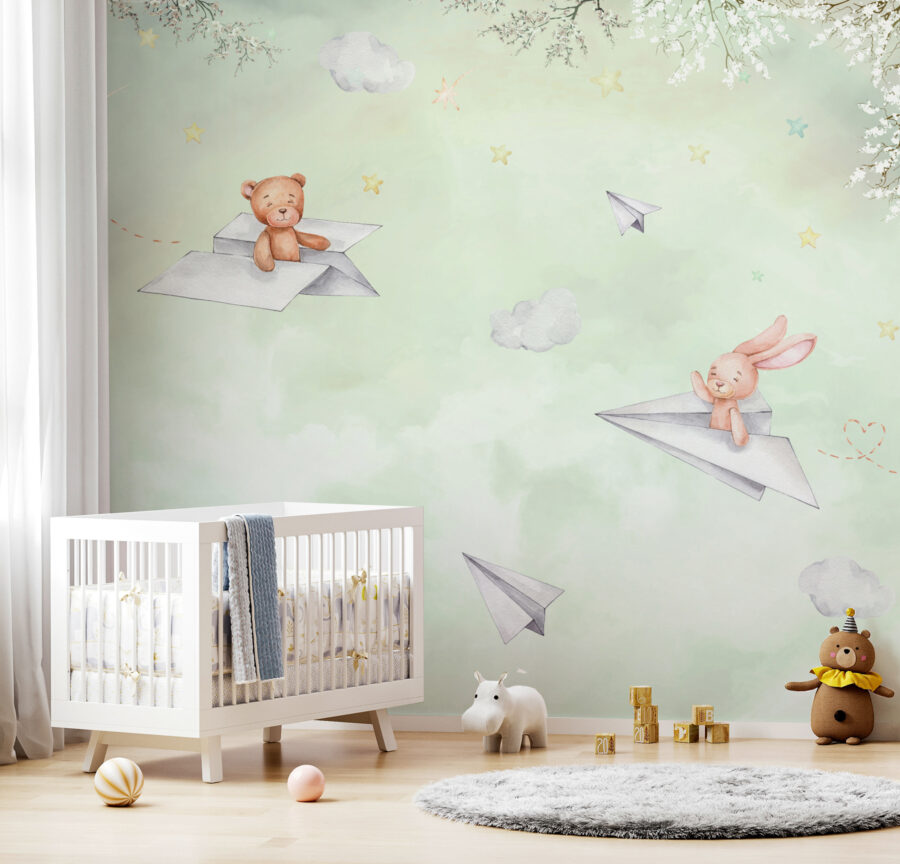 Verwandeln Sie einen Raum mit dieser bezaubernden Fototapete in eine traumhafte Welt. Stellen Sie sich eine Welt vor, in der niedliche Tiere auf Papierfliegern durch die Wolken schweben und dem süßen Flüstern der Träume nachjagen. Dieses Design bringt einen Hauch von Laune mit, den Kinder (und Erwachsene, seien wir ehrlich) lieben werden. Stellen Sie sich vor, wie Ihre Kleinen auf den fröhlichen Bären oder den verspielten Fuchs zeigen und kichern, während sie die Bahnen der Flugzeuge nachzeichnen. Es ist wie ein freundliches Abenteuer direkt in ihrem Zimmer. Die sanften Farben schaffen eine ruhige Atmosphäre, perfekt für Gute-Nacht-Geschichten. Verleihen Sie jeder Wand einen spielerischen Aufschwung und beobachten Sie, wie die Fantasie freien Lauf lässt!