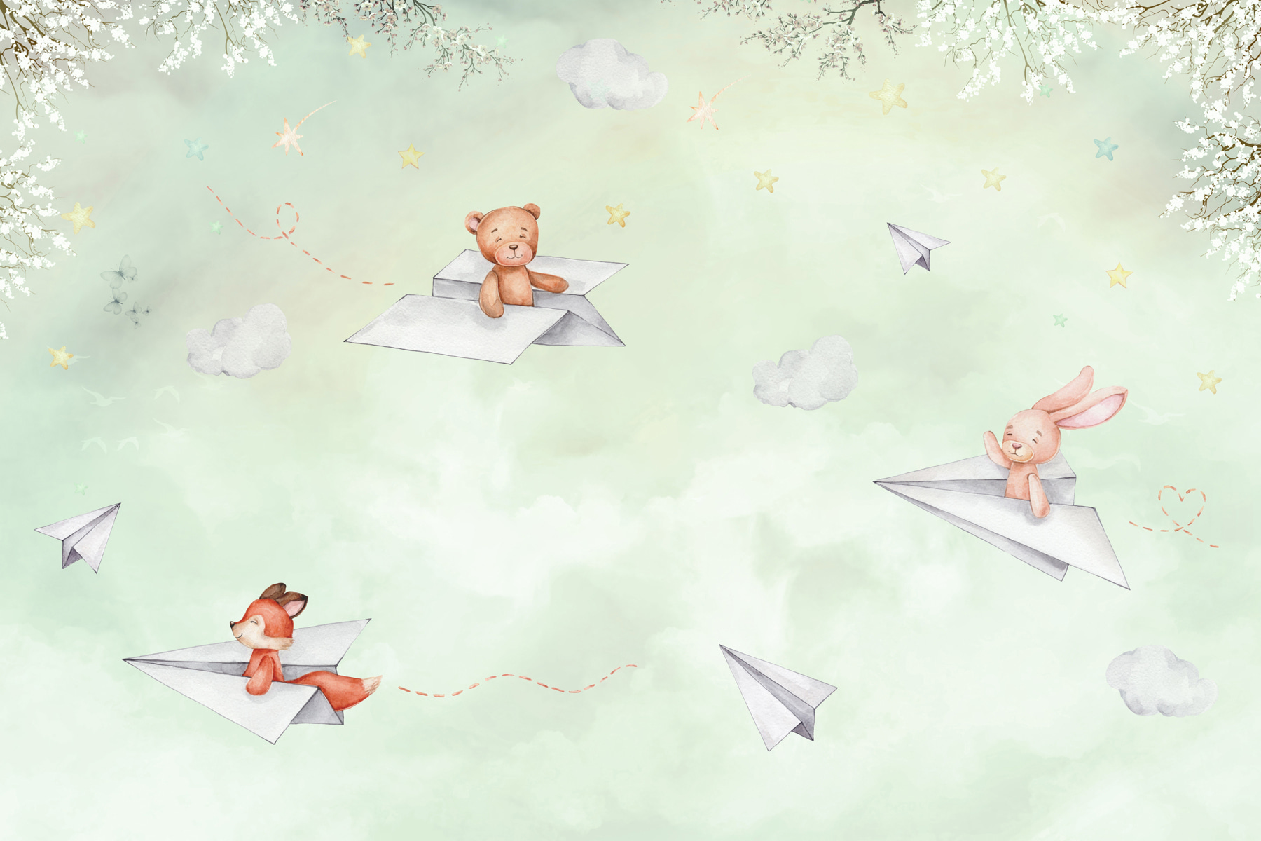 Verwandeln Sie einen Raum mit dieser bezaubernden Fototapete in eine traumhafte Welt. Stellen Sie sich eine Welt vor, in der niedliche Tiere auf Papierfliegern durch die Wolken schweben und dem süßen Flüstern der Träume nachjagen. Dieses Design bringt einen Hauch von Laune mit, den Kinder (und Erwachsene, seien wir ehrlich) lieben werden. Stellen Sie sich vor, wie Ihre Kleinen auf den fröhlichen Bären oder den verspielten Fuchs zeigen und kichern, während sie die Bahnen der Flugzeuge nachzeichnen. Es ist wie ein freundliches Abenteuer direkt in ihrem Zimmer. Die sanften Farben schaffen eine ruhige Atmosphäre, perfekt für Gute-Nacht-Geschichten. Verleihen Sie jeder Wand einen spielerischen Aufschwung und beobachten Sie, wie die Fantasie freien Lauf lässt!