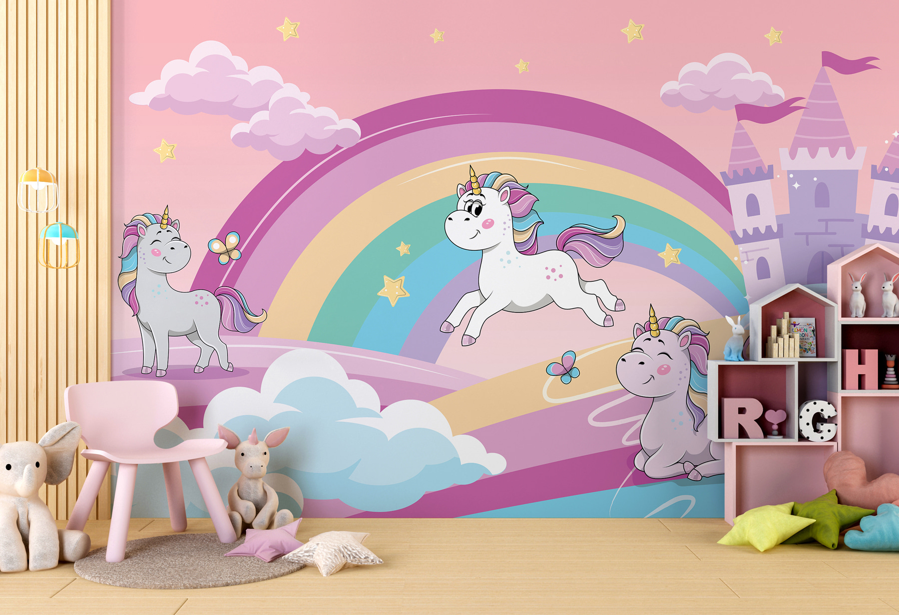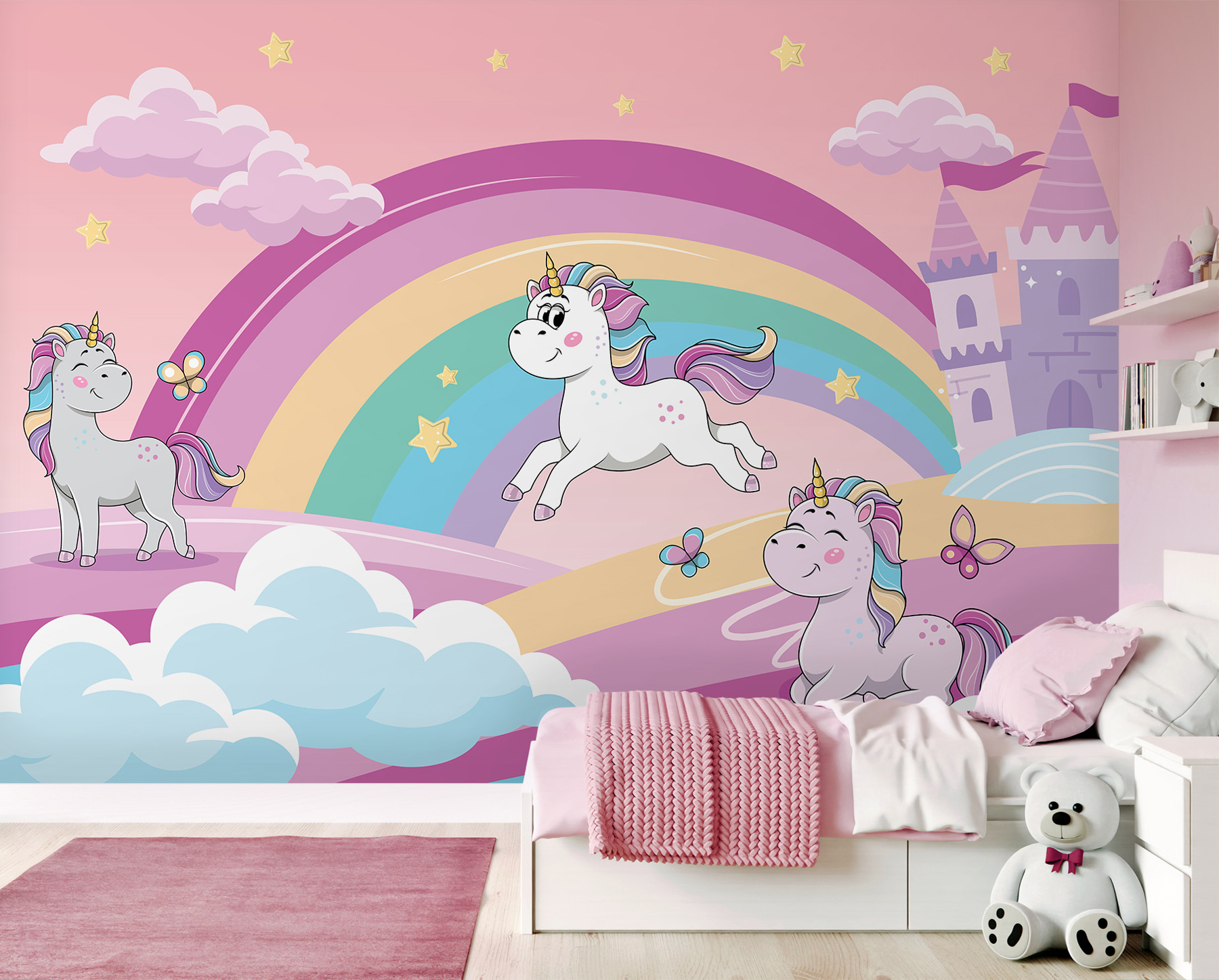 Verwandeln Sie jedes gewöhnliche Zimmer in einen skurrilen Zufluchtsort mit diesem bezaubernden Einhorn-Wandbild! Stellen Sie sich vor, wie Schmetterlinge um bunte Regenbögen tanzen, während verspielte Einhörner unter einem sanften rosa Himmel herumtollen. Es ist, als würde man in ein Märchenbuch eintauchen, in dem die Magie nur einen Herzschlag entfernt ist. Dieses Wandbild ist perfekt geeignet, um die Fantasie Ihrer Kleinen anzuregen, und verleiht ihnen ein gemütliches, lustiges Gefühl, das jeden Tag zu einem Abenteuer werden lässt. Es wird mit Sicherheit ein Lächeln und Kichern hervorrufen und jedes Mal, wenn Ihr Kind das Haus betritt, ein wenig Freude verbreiten. Wer wünscht sich nicht ein bisschen Märchenzauber an seinen Wänden?