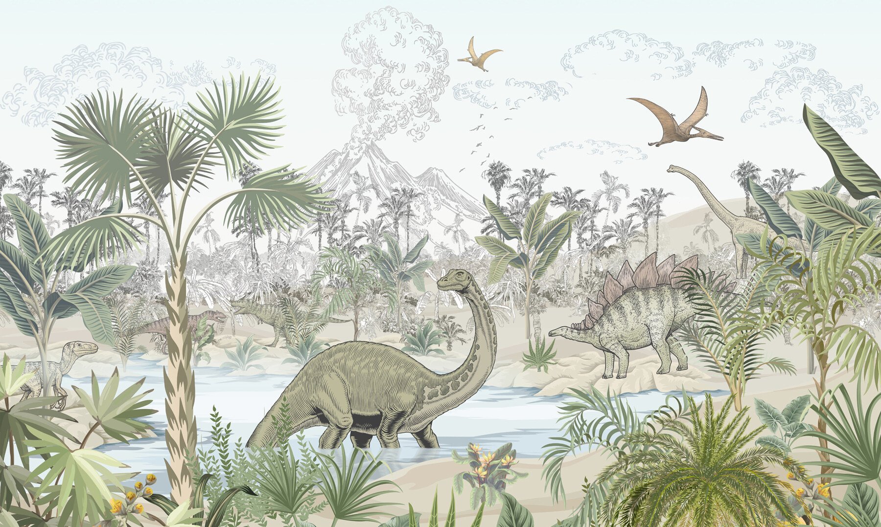 Verwandeln Sie den Raum eines Kindes in ein prähistorisches Paradies mit diesem lebendigen Wandbild, das majestätische Dinosaurier zeigt, die in ihrem üppigen tropischen Zuhause umherstreifen. Stellen Sie sich vor, wie aufgeregt die Kleinen diese sanften Riesen bei der Erkundung ihrer fantastischen Welt beobachten. Mit den sich wiegenden Palmen und dem brodelnden Vulkan im Hintergrund regt dieses Wandbild die Fantasie an und sorgt für Abenteuer, die über Gutenachtgeschichten hinausgehen.