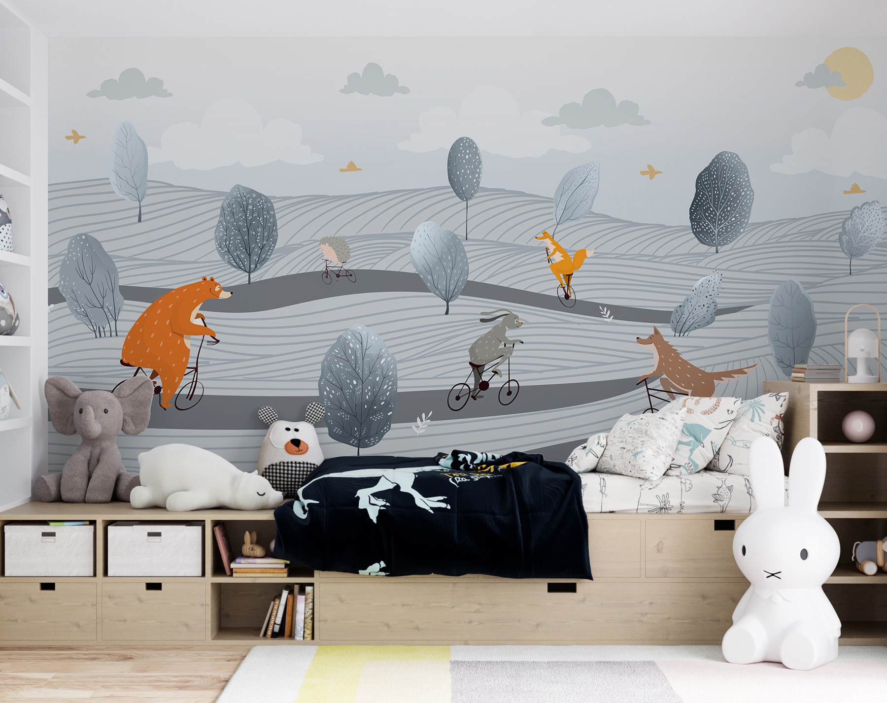 Verwandeln Sie jeden Raum mit dieser skurrilen Fototapete, die eine Parade von charmanten Tieren auf Fahrrädern zeigt! Stellen Sie sich einen Bären, einen Fuchs und einen Igel vor, die durch eine verträumte Landschaft fahren. Es ist wie eine Szene aus einem bezaubernden Kinderbuch, perfekt um ein Lächeln zu erzeugen und die Fantasie anzuregen. Ob für ein Spielzimmer, ein Kinderzimmer oder einfach für eine lustige Auffrischung Ihres Wohnbereichs, dieses Wandbild verleiht eine verspielte Note, die die Stimmung hebt. Betrachten Sie es als einen freundlichen Begleiter an Ihren Wänden, der jeden einlädt, sich auf dieses fröhliche Abenteuer einzulassen. Wer würde sich nicht über eine Prise Humor und Laune in seinem Alltag freuen?