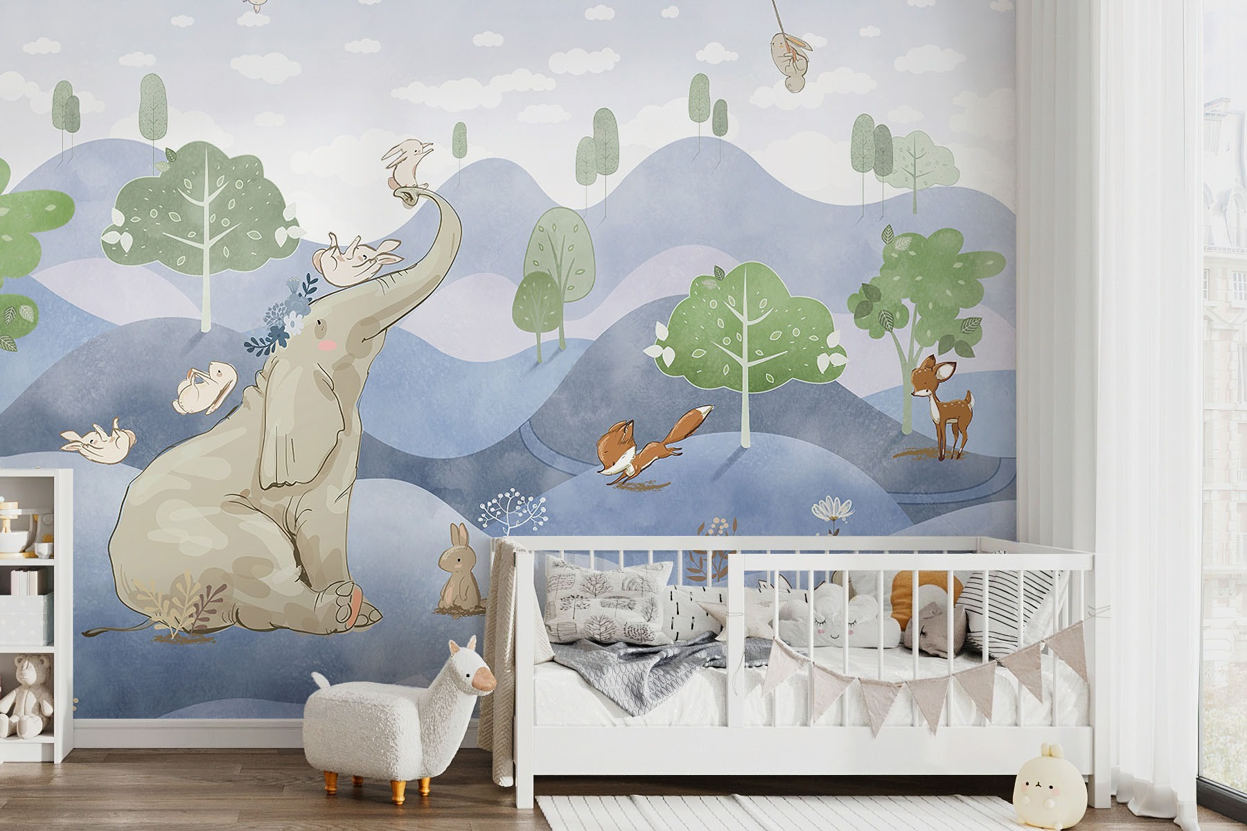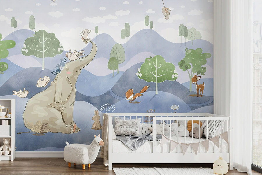 Stellen Sie sich vor, Sie verwandeln Ihr Kinderzimmer mit dieser verspielten Fototapete in ein skurriles Wunderland. Das niedliche Kaninchen, das eine Blume in der Hand hält, und die fröhlichen Tiere wie der Elefant, der Fuchs und das Reh sind einem Märchenbuch entsprungen. Die Pastellfarben und die verträumte Landschaft vermitteln ein Gefühl der Ruhe und Freude – perfekt, um die Fantasie der Kleinen anzuregen. Stellen Sie sich vor, wie Geschichten vor dem Schlafengehen zum Leben erweckt werden, oder wie Sie sich an faulen Nachmittagen in Tagträumen verlieren. Lassen Sie dieses Wandbild jeden Raum erstrahlen und schaffen Sie einen magischen Ort, an dem Abenteuer und Frieden koexistieren.