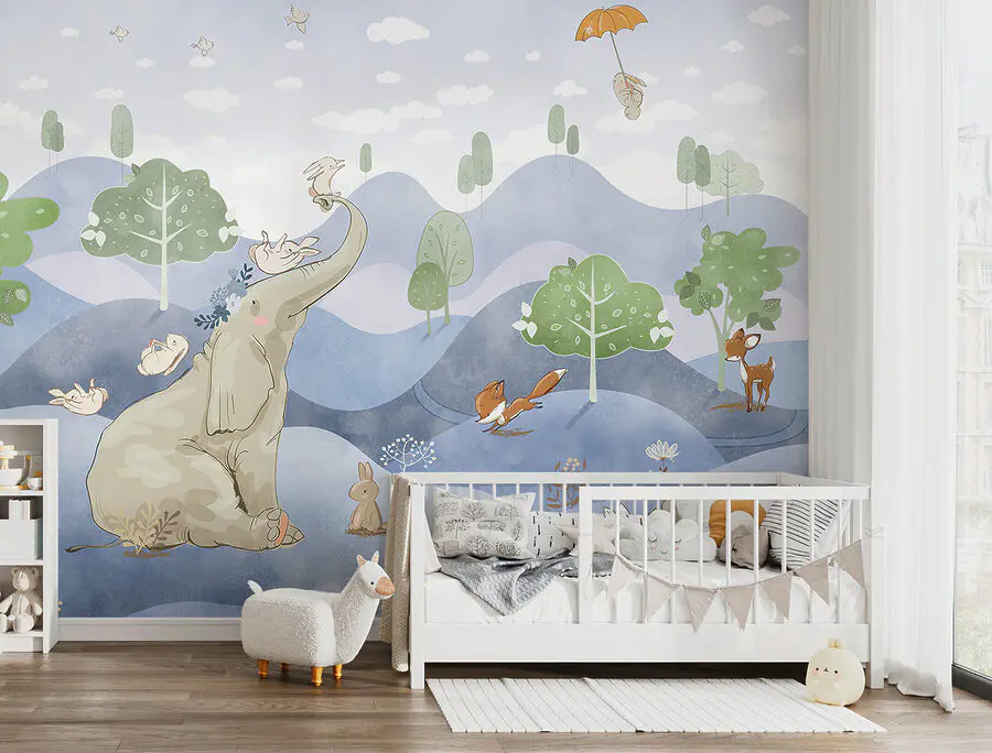 Stellen Sie sich vor, Sie verwandeln Ihr Kinderzimmer mit dieser verspielten Fototapete in ein skurriles Wunderland. Das niedliche Kaninchen, das eine Blume in der Hand hält, und die fröhlichen Tiere wie der Elefant, der Fuchs und das Reh sind einem Märchenbuch entsprungen. Die Pastellfarben und die verträumte Landschaft vermitteln ein Gefühl der Ruhe und Freude – perfekt, um die Fantasie der Kleinen anzuregen. Stellen Sie sich vor, wie Geschichten vor dem Schlafengehen zum Leben erweckt werden, oder wie Sie sich an faulen Nachmittagen in Tagträumen verlieren. Lassen Sie dieses Wandbild jeden Raum erstrahlen und schaffen Sie einen magischen Ort, an dem Abenteuer und Frieden koexistieren.