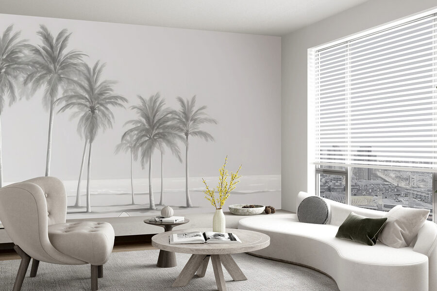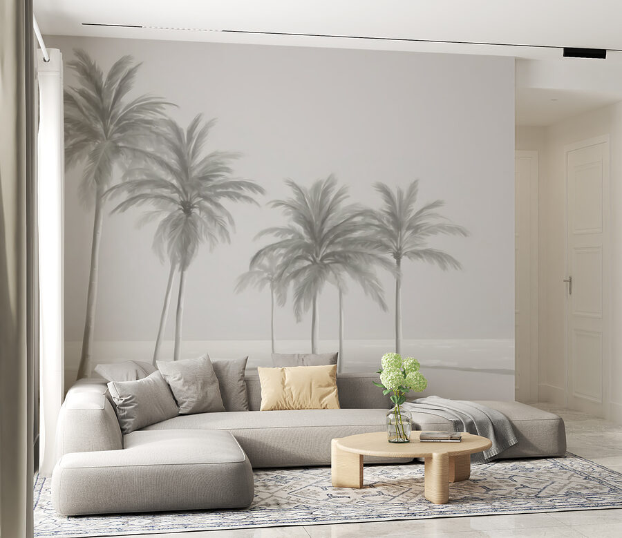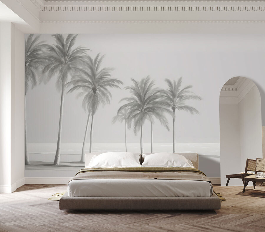 Diese Fototapete zeigt eine Szene mit mehreren hohen, eleganten Palmen, die sich sanft wiegen, als ob sie von einer Küstenbrise berührt würden. Durch die sanften, gedämpften Farben wirkt es fast traumhaft, ein bisschen wie ein Vintage-Foto, das einen ruhigen Tag an der Küste festhält. Das Bild passt zu jeder Einrichtung – ob modern oder Boho, alles ist möglich. Außerdem ist es sehr beruhigend; die Art von Aussicht, die einen sofort aufatmen lässt.