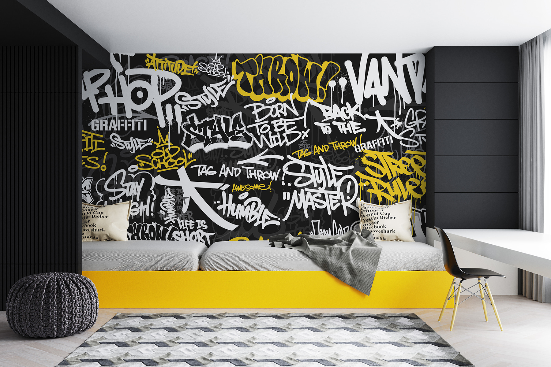 Diese Fototapete “Gelbes Graffiti auf schwarzem Hintergrund” ist ein echter Hingucker. Perfekt, um jedem Raum einen Hauch von urbaner Coolness zu verleihen. Stellen Sie sich vor, dass sich das Zimmer Ihres Teenagers plötzlich wie eine Gasse in der Innenstadt anfühlt – voller jugendlicher Energie und rebellischem Geist. Es ist, als ob man sich die Straßenkunst ins Haus holt, ohne die Dämpfe der Sprühfarbe! Außerdem ist der Mix aus Gelb und Schwarz wirklich auffallend und verleiht einem Raum diesen unerwarteten Pop, der ihn aufwecken kann. Dieses Wandbild ist überraschend raffiniert und gleichzeitig total frisch. Es ist perfekt für alle jungen oder jung gebliebenen Menschen, die wollen, dass ihre Wände Bände sprechen.
