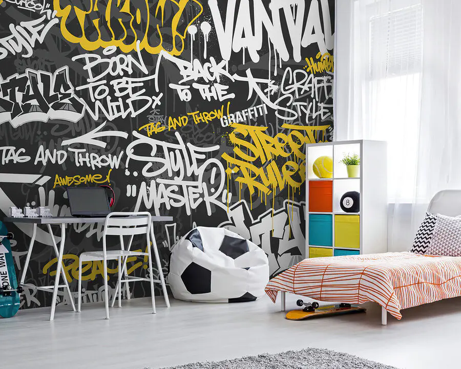 Diese Fototapete “Gelbes Graffiti auf schwarzem Hintergrund” ist ein echter Hingucker. Perfekt, um jedem Raum einen Hauch von urbaner Coolness zu verleihen. Stellen Sie sich vor, dass sich das Zimmer Ihres Teenagers plötzlich wie eine Gasse in der Innenstadt anfühlt – voller jugendlicher Energie und rebellischem Geist. Es ist, als ob man sich die Straßenkunst ins Haus holt, ohne die Dämpfe der Sprühfarbe! Außerdem ist der Mix aus Gelb und Schwarz wirklich auffallend und verleiht einem Raum diesen unerwarteten Pop, der ihn aufwecken kann. Dieses Wandbild ist überraschend raffiniert und gleichzeitig total frisch. Es ist perfekt für alle jungen oder jung gebliebenen Menschen, die wollen, dass ihre Wände Bände sprechen.