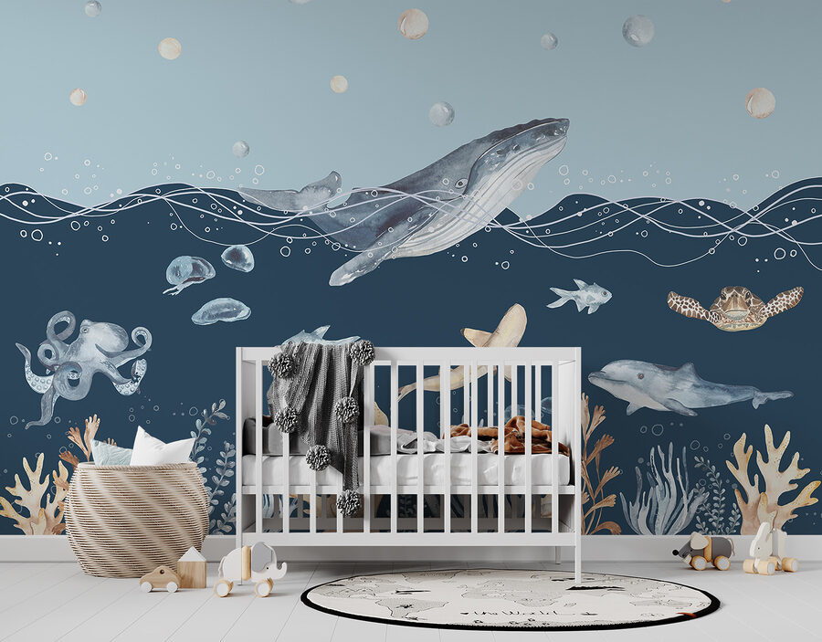 Stellen Sie sich vor: ein anmutiger Wal, der durch die Tiefen gleitet, umgeben von fröhlichen Fischen und bunten Korallen. Es ist, als ob Sie sich ein Stückchen Meer in Ihr Zuhause holen würden. Es ist beruhigend und skurril zugleich, eine perfekte Kulisse für Gute-Nacht-Geschichten oder abenteuerliche Spielzeiten.