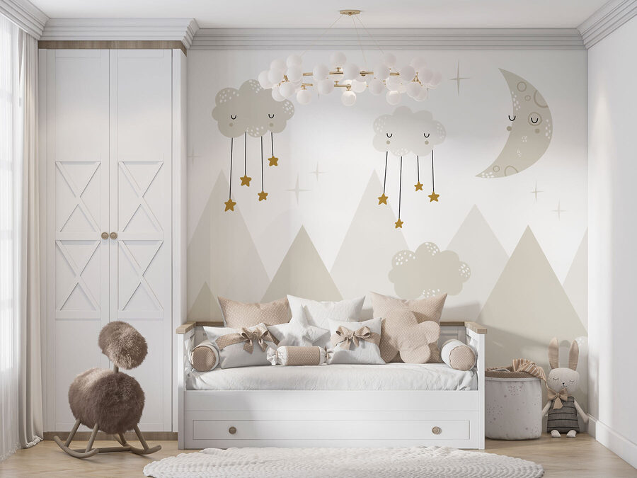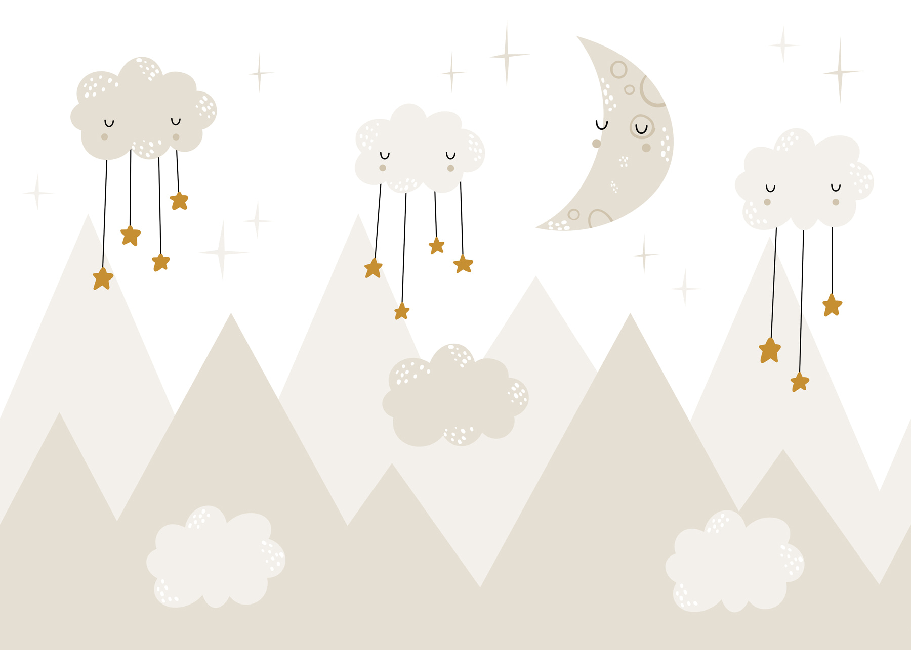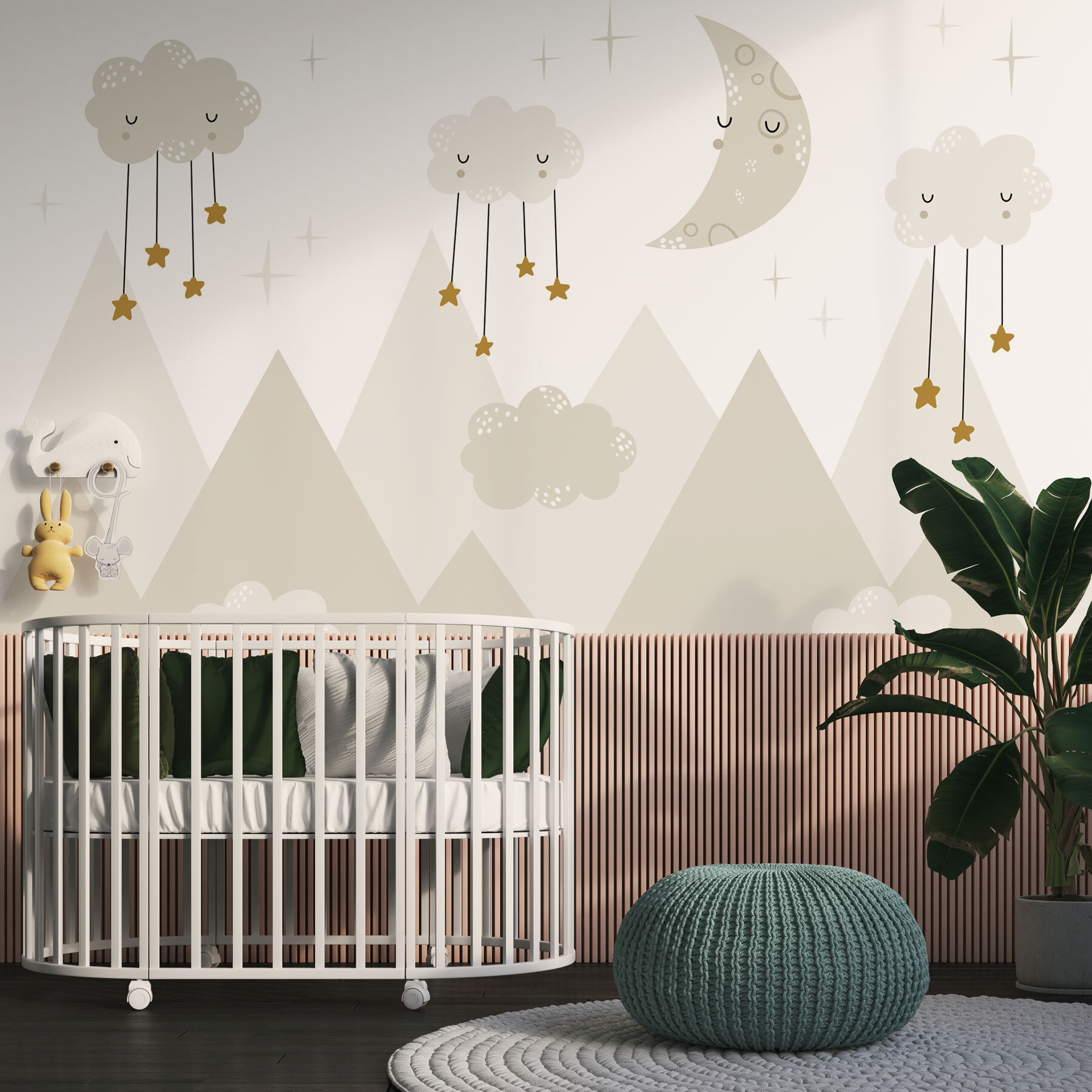 Stellen Sie sich das vor: ein verträumter Nachthimmel mit einem verschlafenen Mond und gemütlichen Wolken, die mit Sternen behangen sind und sanft über Berggipfeln leuchten. Es ist, als würde man in eine skurrile Gute-Nacht-Geschichte eintauchen! Dieses Wandbild ist perfekt für ein Kinderzimmer geeignet und verbindet Fantasie und Gemütlichkeit – es regt die Kreativität der Kleinen an und schafft gleichzeitig ein beruhigendes Ambiente. Denken Sie an all die süßen Träume und das Kichern vor dem Schlafengehen. Und wer würde es nicht lieben, unter einer solch entzückenden und beruhigenden Szene einzuschlafen? Es ist mehr als nur Dekoration – es ist ein kleines Abenteuer, direkt an der Wand.