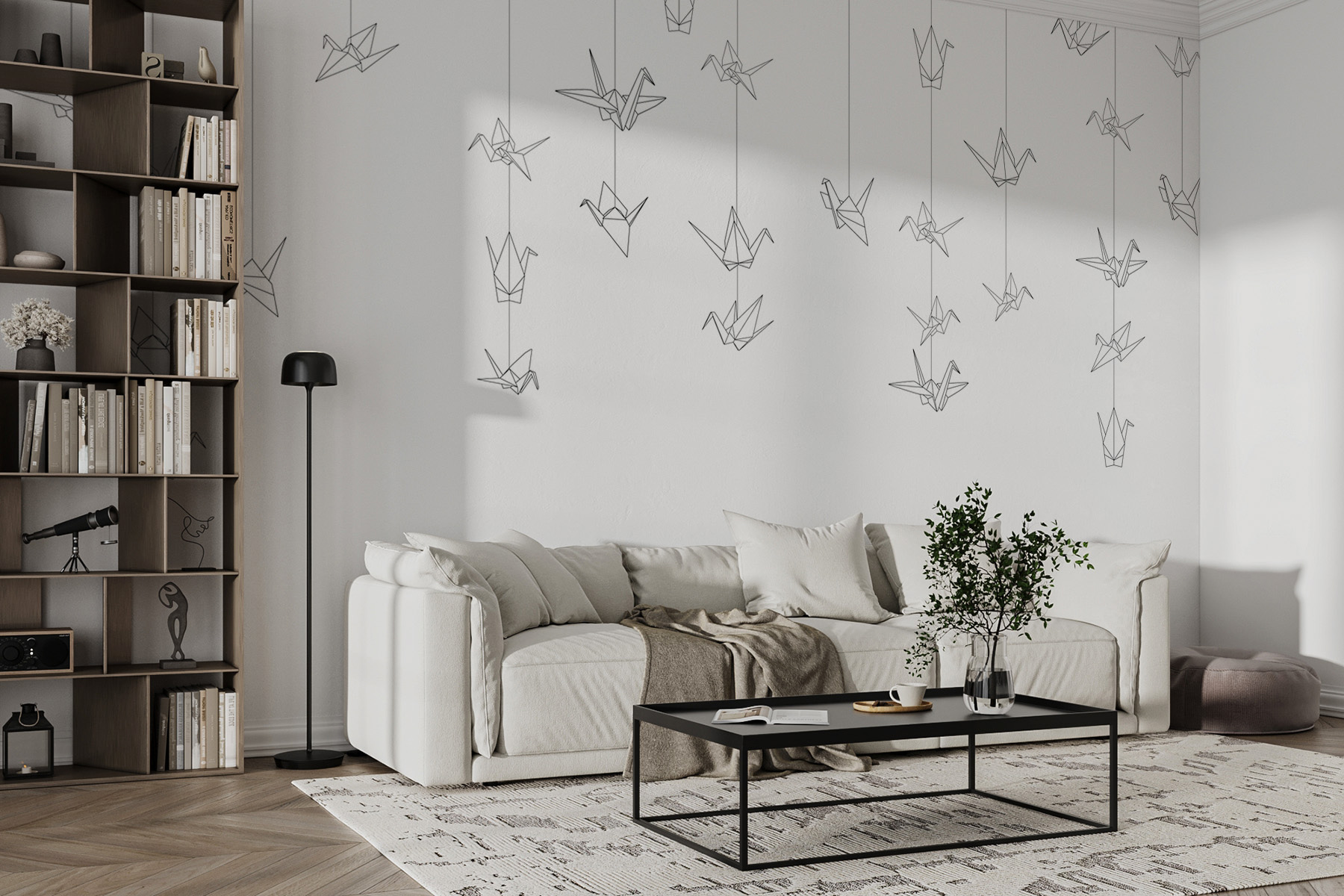 Haben Sie schon einmal daran gedacht, Ihre Wände mit minimalem Aufwand künstlerisch zu gestalten? Sehen Sie sich diese schwarz-weiße Vogeltapete an. Es ist, als hätte man ein Stück aus seinem Lieblings-Skizzenbuch auf Lebensgröße vergrößert. Die einfachen Linien verleihen ihm eine elegante und moderne Ausstrahlung. Stellen Sie sich das Wandbild in Ihrem Wohnzimmer oder an Ihrem Arbeitsplatz vor – ein Bild, das Sie dazu bringt, eine Minute durchzuatmen und zu entspannen. Außerdem haben die sanft hängenden Papierkraniche etwas sehr Beruhigendes, fast so, als ob sie fliegen würden. Es ist die perfekte Mischung aus Kunst und Entspannung. Wenn Sie eine Vorliebe für einzigartige Dekoration haben, die Freude macht (ja, ein Marie Kondo-Moment), dann ist dieses Wandbild genau das Richtige für Sie.