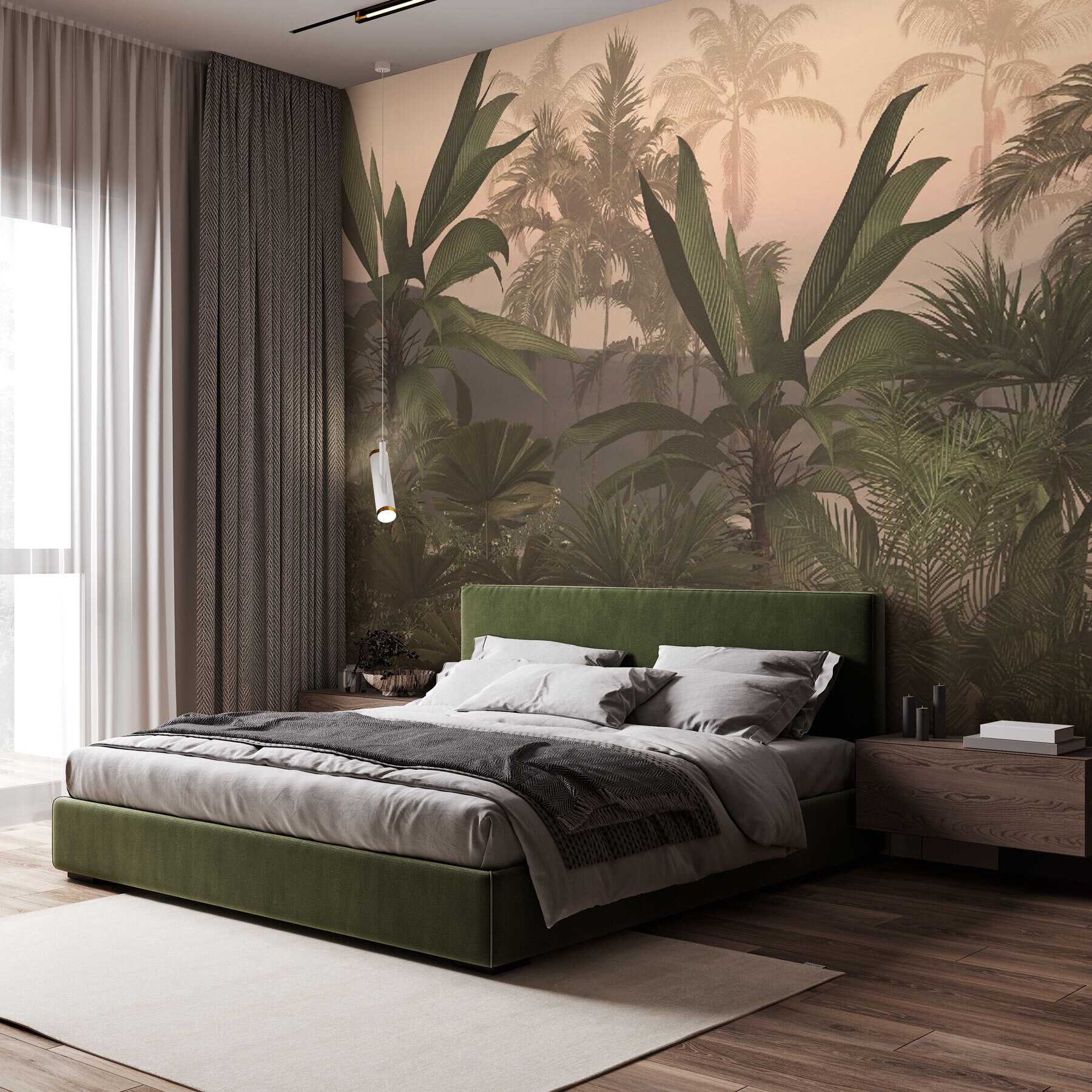 Der weiche, dunstige Hintergrund in Kombination mit den leuchtend grünen Blättern lässt jeden Raum lebendig und erfrischend erscheinen. Ob im Wohnzimmer, im Schlafzimmer oder sogar im Büro, es wird Ihnen das Gefühl geben, ständig auf der Flucht zu sein. Und das Beste daran? Kein Ungeziefer! Nur endlose Ruhe und ein Hauch von exotischem Charme direkt an Ihren Wänden.