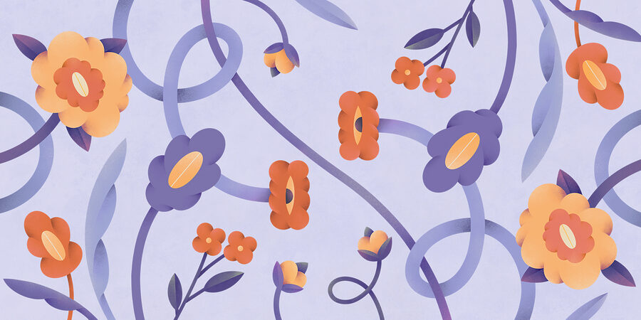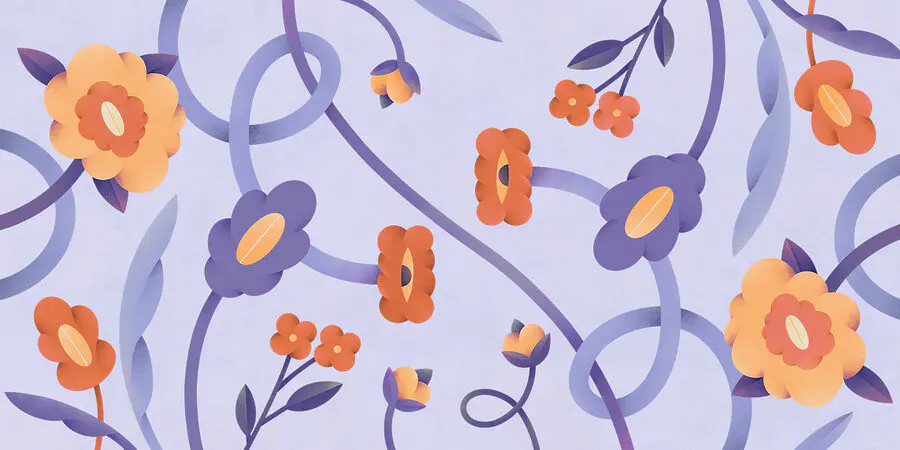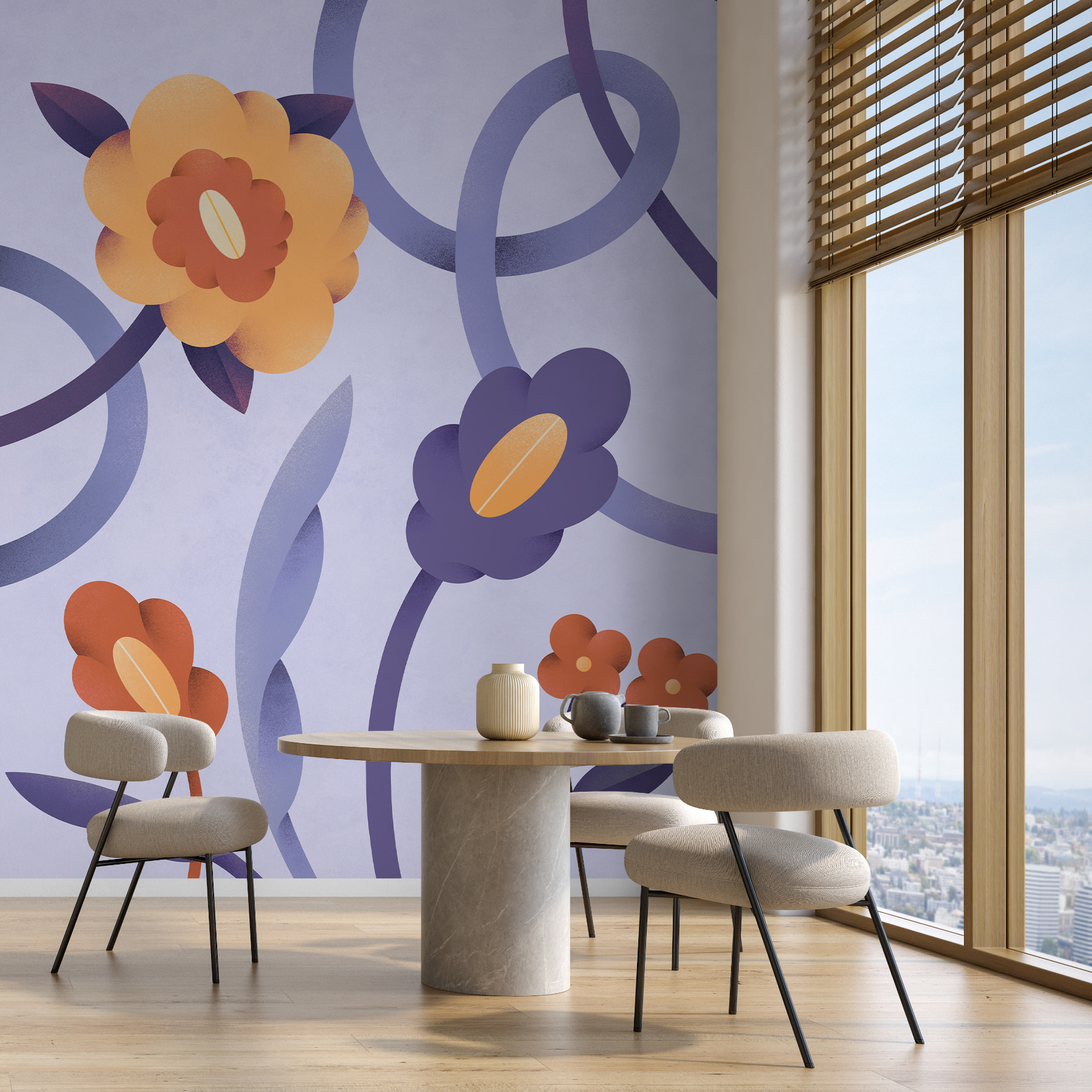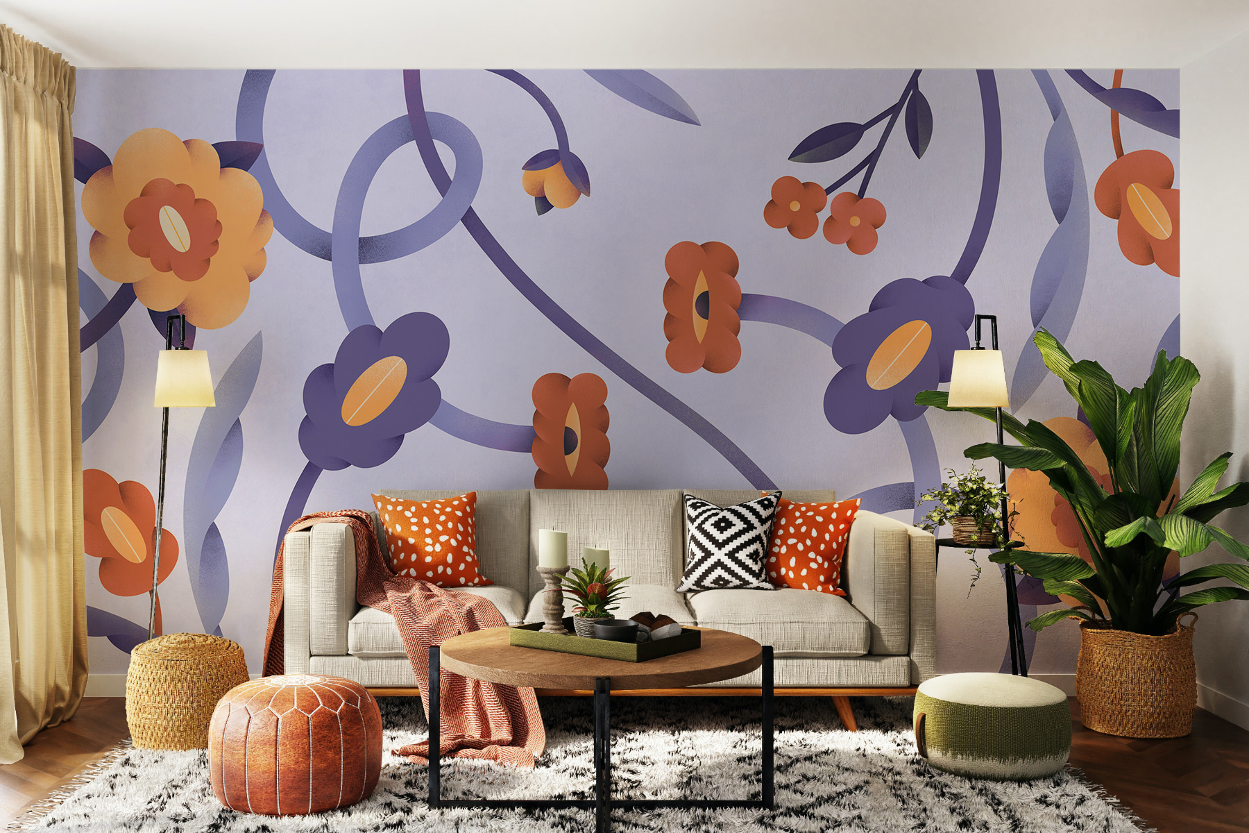 “Wandbilder Lila und orangefarbene Blumen und Ranken” sind wie ein fröhlicher, verträumter Garten. Die ineinander verschlungenen Ranken und Blüten in kräftigem Lila und sonnigem Orange sprühen nur so vor Energie. Stellen Sie sich vor, Sie wachen mit dieser lebendigen Szene auf – das hebt die Stimmung sofort! Es ist, als hätte man einen Hauch von Sommer direkt an der Wand, egal zu welcher Jahreszeit.