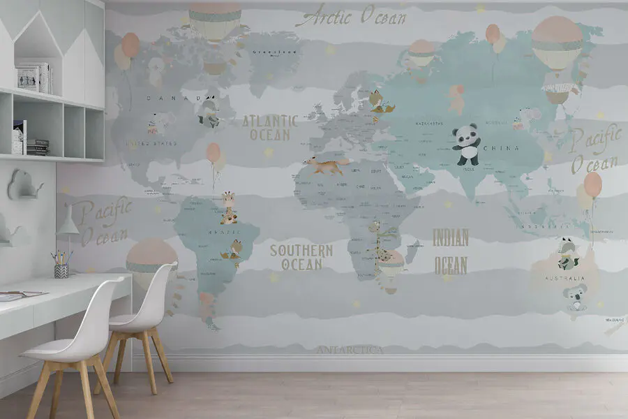 Dieses bezaubernde Wandbild “Heißluftballon am Himmel” wird die Fantasie Ihrer Kinder auf ein magisches Abenteuer entführen. Stellen Sie sich eine Weltkarte vor, wunderschön weich und pastellfarben, bedeckt mit den niedlichsten Tieren in Heißluftballons – es gibt sogar einen verspielten Panda und eine neugierige Giraffe! Das ist wie eine globale Safari direkt an der Wand. Perfekt für ein Kinderzimmer oder ein verspieltes Kinderzimmer, regt dieses Wandbild zum Staunen über die große, weite Welt an. Es regt garantiert zu Gute-Nacht-Geschichten an, in denen es darum geht, über die glitzernden Ozeane zu fliegen und in fernen Ländern zu landen. Ideal für kleine Entdecker – und auch die Eltern könnten sich beim Träumen erwischen. Es ist gemütlich, skurril und voller Charme – genau das, was der Raum eines Kindes braucht!