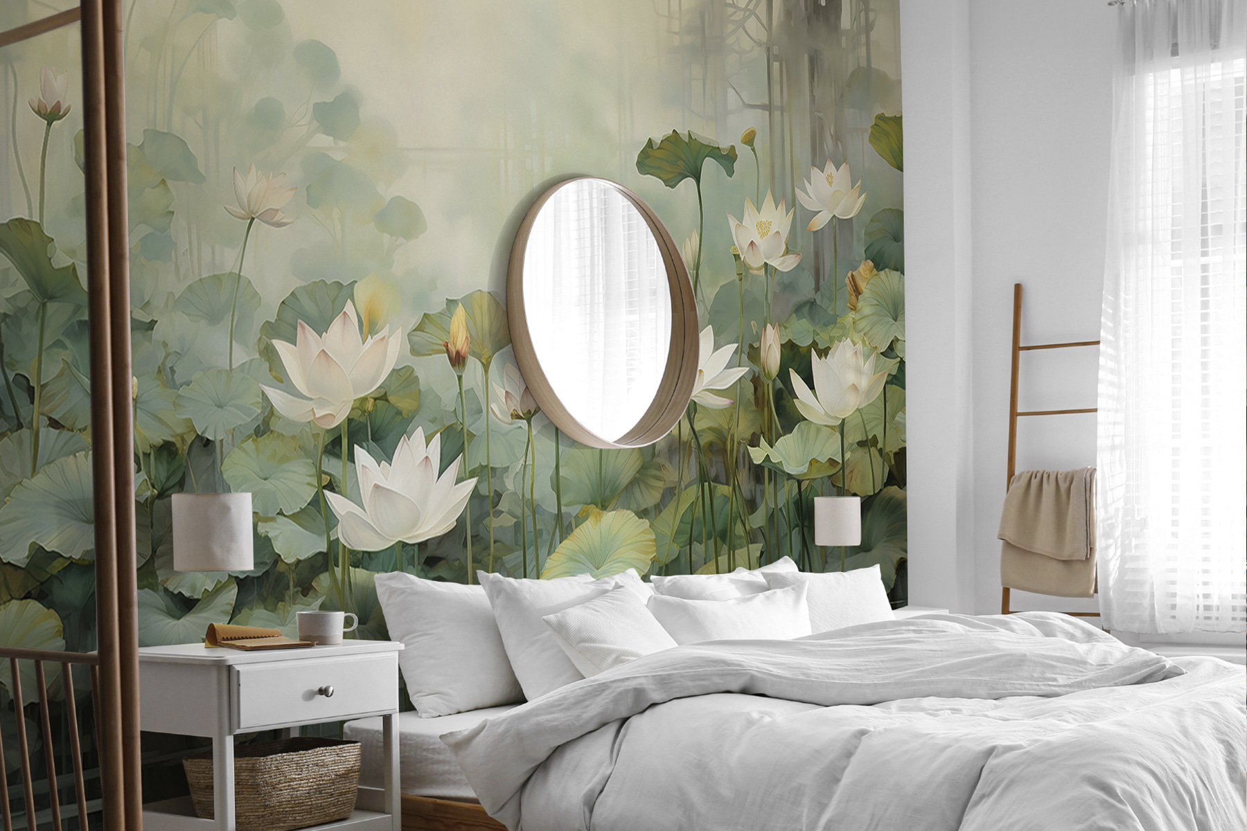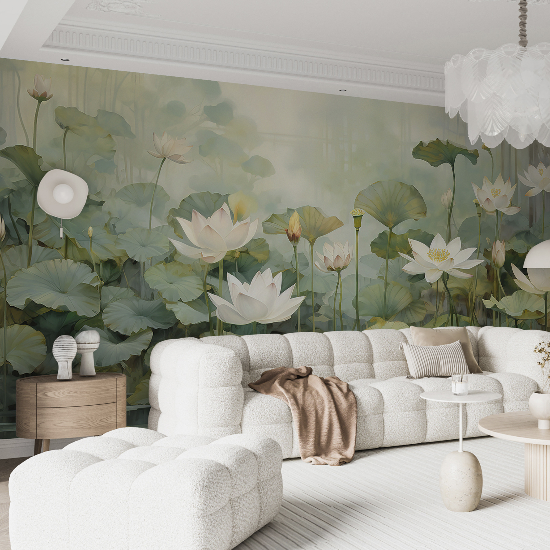 Stellen Sie sich vor, Sie betreten einen ruhigen Zufluchtsort mit dieser bezaubernden Wandmalerei eines ruhigen Teiches, der mit zarten Blüten übersät und von üppigem Grün umgeben ist. Es ist, als ob Sie sich einen friedlichen Rückzugsort direkt in Ihr Zuhause holen würden. Die sanften Farbtöne laden zum Innehalten und Durchatmen ein und wecken das Gefühl von faulen Nachmittagen an einem ruhigen See. Stellen Sie sich vor, wie Sie sich mit einer Tasse Tee und einem guten Buch in der Hand in der Schönheit der Natur verlieren, ohne den Raum zu verlassen. Dieses Wandbild ist ideal für einen gemütlichen Wohnraum oder eine ruhige Leseecke. Es vermittelt Entspannung und einen Hauch von Laune und lässt jede Wand wie ein Fenster zu einem magischen Garten erscheinen.