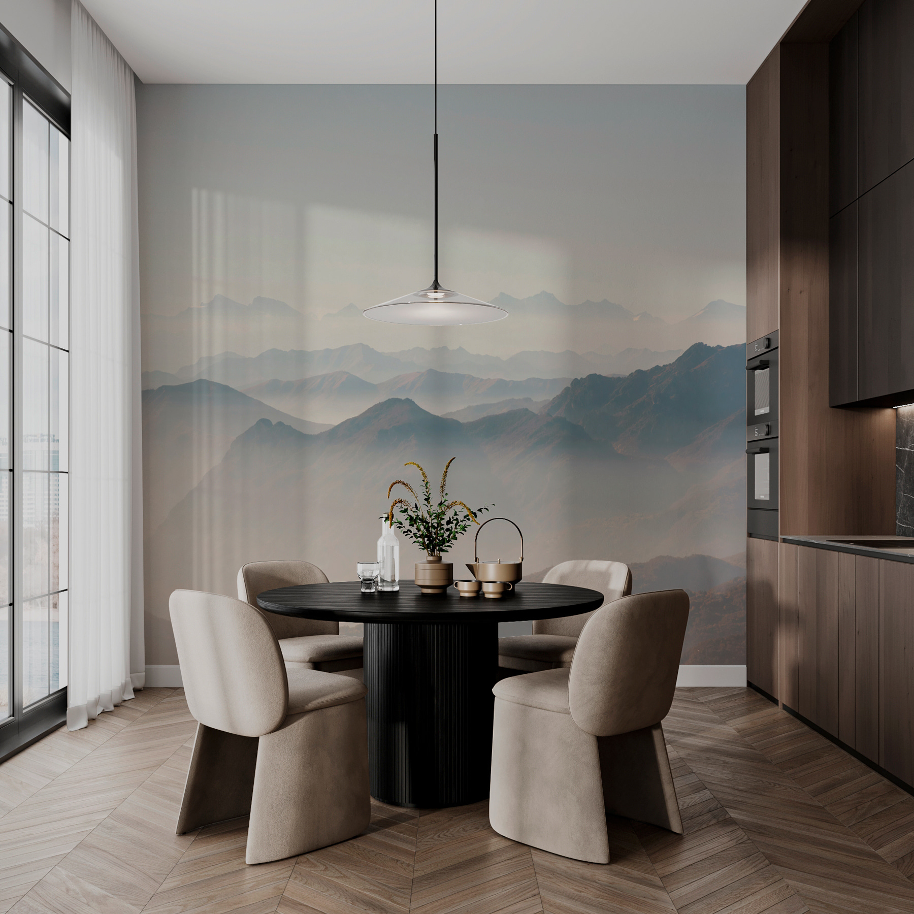 Verwandeln Sie jeden Raum in einen ruhigen Zufluchtsort mit dieser atemberaubenden Wandmalerei einer in Nebel gehüllten Bergkette. Stellen Sie sich vor, wie Sie an einem faulen Sonntagmorgen an Ihrem Kaffee nippen und dabei auf die sanft geschwungenen Gipfel blicken. Es ist wie ein kleiner Urlaub für die Wände. Die gedämpften Farben rufen ein Gefühl der Ruhe hervor, das sich perfekt für ein gemütliches Wohnzimmer oder ein ruhiges Schlafzimmer eignet. Stellen Sie sich vor, dass diese Fototapete eine Kulisse schafft, die Tagträume von frischer Luft und Bergwanderungen weckt, ohne dass man dafür Wanderschuhe braucht. Es ist ein Dekor, das eine Geschichte erzählt und die Natur mit einem Hauch von Abenteuer ins Haus bringt.