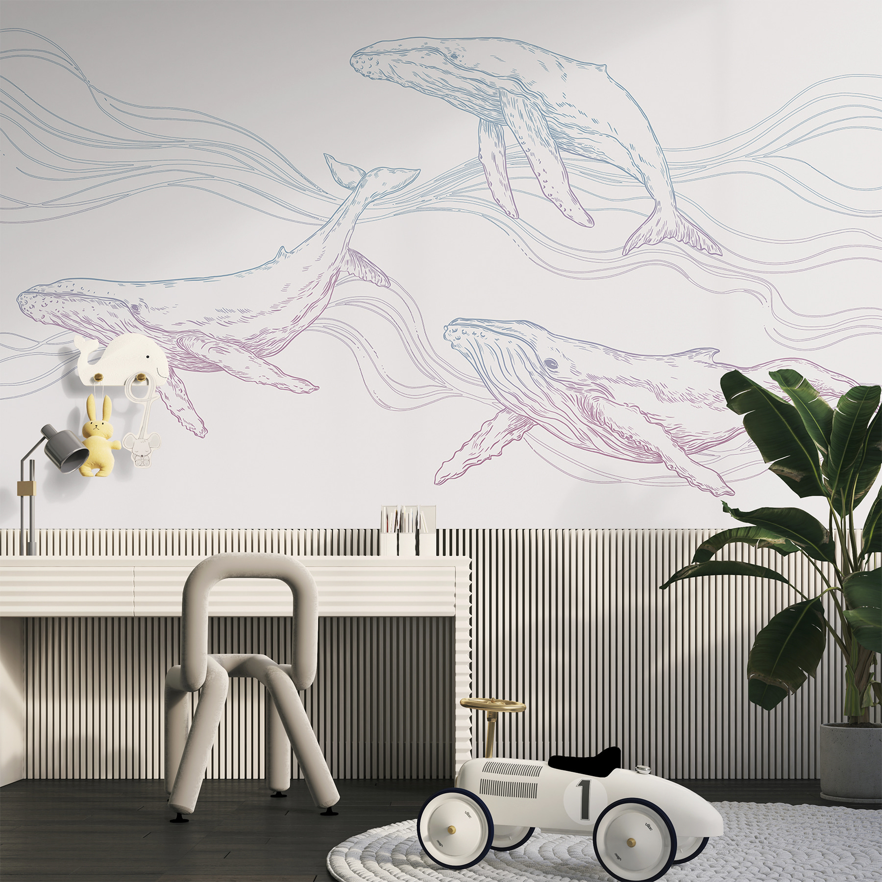 Verwandeln Sie jeden Raum in ein Meer mit dieser atemberaubenden Fototapete, die eine Gruppe von Walen zeigt, die anmutig durch das Wasser schwimmen. Stellen Sie sich vor, Sie wachen mit der sanften, beruhigenden Präsenz dieser majestätischen Kreaturen auf, von denen jede einzelne an die Schönheit des tiefen Blaus erinnert. Die weichen, fließenden Linien und die Pastelltöne schaffen eine heitere Atmosphäre – perfekt für ein gemütliches Wohnzimmer oder einen beruhigenden Rückzugsort im Schlafzimmer. Es ist, als hätte man ein Stück Meer direkt zu Hause. Freunde werden die Kunstwerke bewundern, und wer würde sich nicht ein wenig entspannter fühlen, wenn er von den Giganten der Natur umgeben ist? Tauchen Sie ein in eine Welt, die die Wunder des Ozeans in Ihr tägliches Leben bringt.
