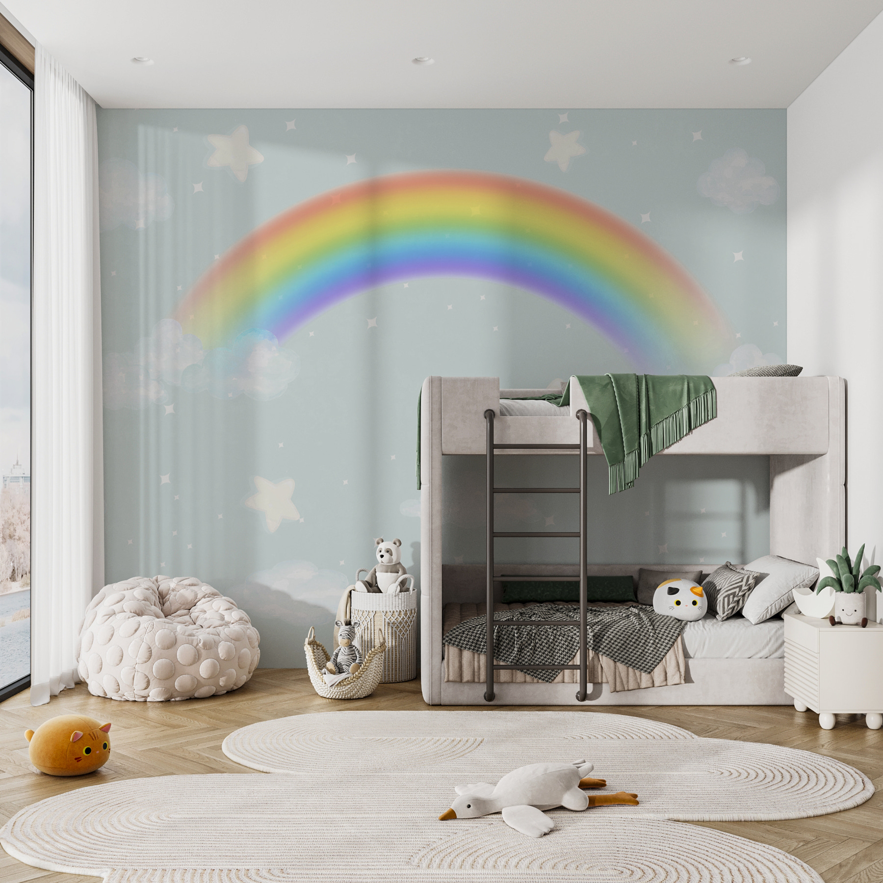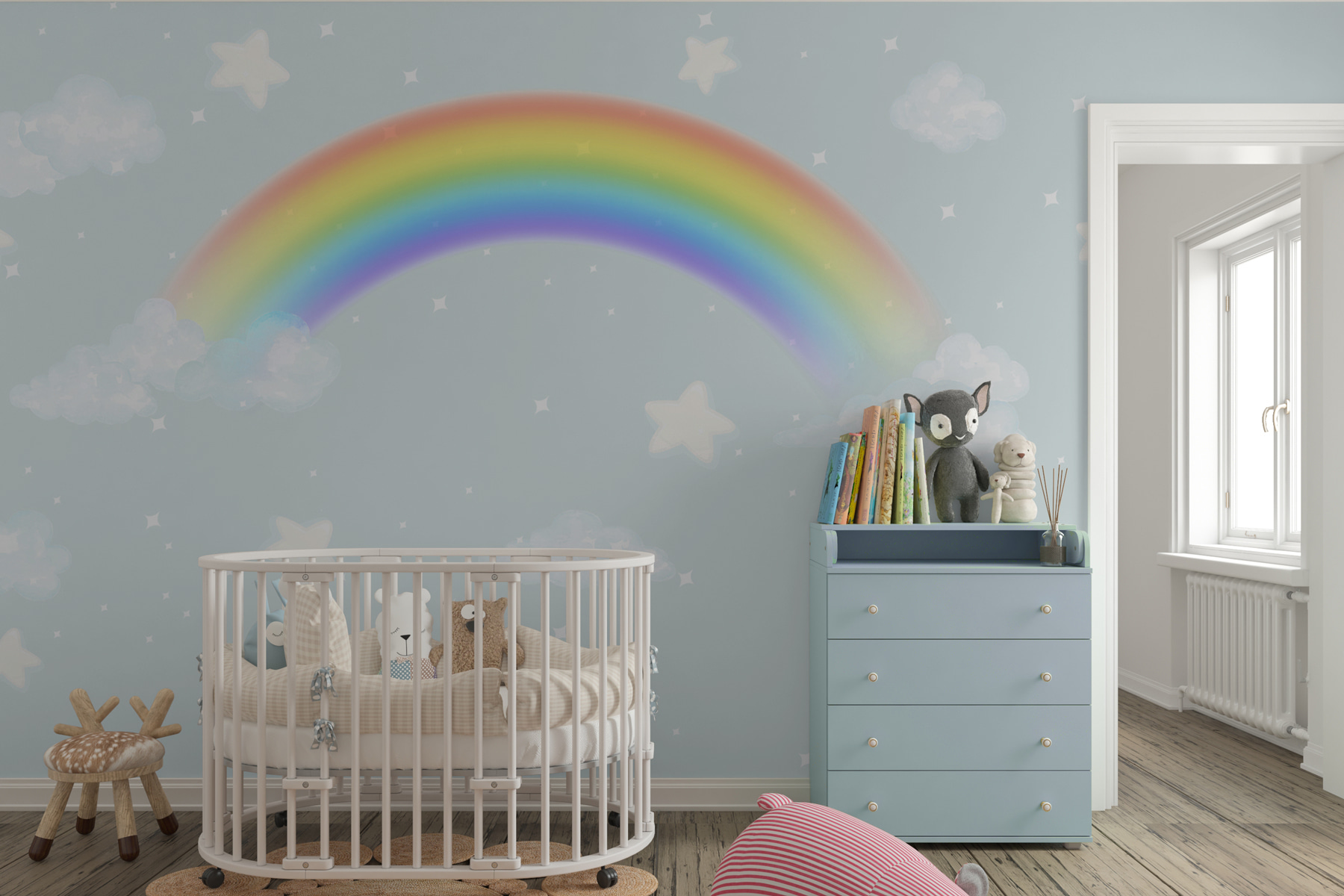 Diese Fototapete sieht nicht nur gut aus, sie hat auch etwas Magisches. Stellen Sie sich vor, wie Sie sich an einem Regentag mit einer heißen Schokolade in der Hand entspannen, während diese Fototapete einen Hauch von frischer Luft und einen Farbklecks bringt. Vielleicht verirren Sie sich in dem ruhigen blauen Hintergrund oder denken sich mit Ihren Kindern Geschichten über die Sterne und Wolken aus. Es ist freundlich, einladend und lässt den Raum sofort größer und heller erscheinen.