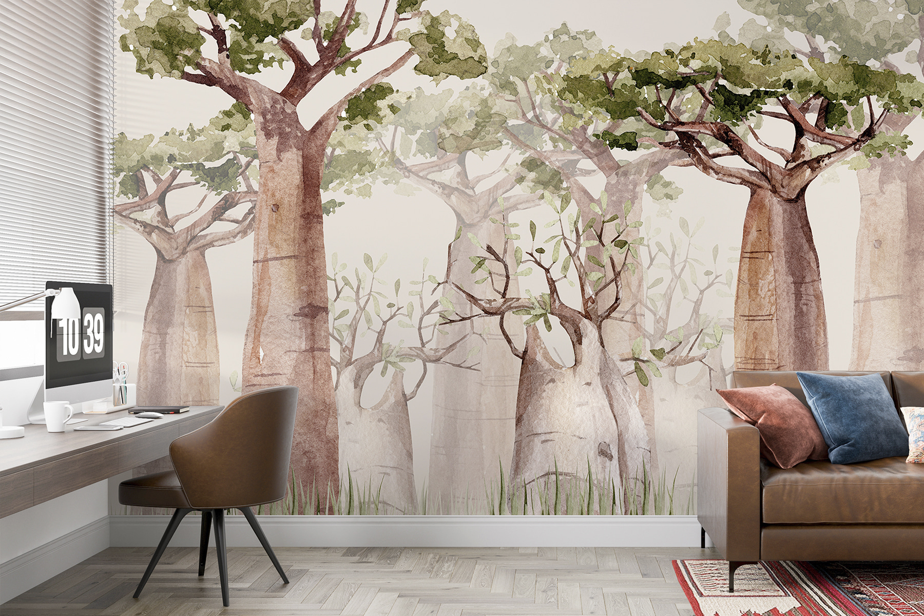 Tauchen Sie mit der Fototapete “Majestätische Affenbrotbäume im Aquarellwald” in eine Traumlandschaft ein – perfekt, um jeden Raum in ein skurriles Waldgebiet zu verwandeln. Stellen Sie sich vor, Sie betreten einen Raum, in dem diese hoch aufragenden Affenbrotbäume Sie mit ihrem sanften Aquarellcharme begrüßen. Kinder würden es lieben und sich wie kleine Entdecker in einem üppigen, magischen Wald fühlen. Die sanften Farbtöne sorgen für eine gemütliche, natürliche Atmosphäre und verleihen dem Raum einen Hauch von Mystik. Stellen Sie sich ein Kinderzimmer oder ein Spielzimmer vor, das sich in einen bezaubernden Rückzugsort verwandelt hat; es ist, als ob die Märchenstunde ein Upgrade bekommen hätte. Die sanften Grün- und Erdtöne wirken sehr beruhigend und sind ideal für eine Leseecke oder sogar als Hintergrund für die tägliche Entspannung. Genau das Richtige für alle, die einen Hauch von Tropen und einen Hauch von Kreativität in ihr Zuhause bringen wollen. Machen Sie sich bereit für alle Komplimente und vielleicht ein paar “Oohs” und “Aahs”!